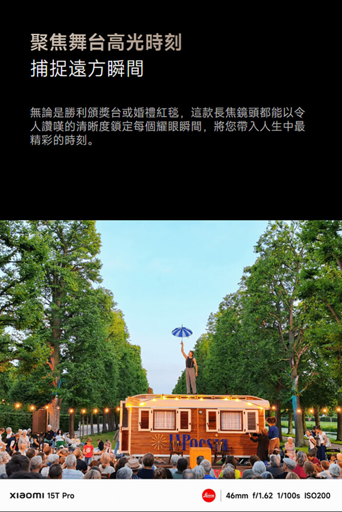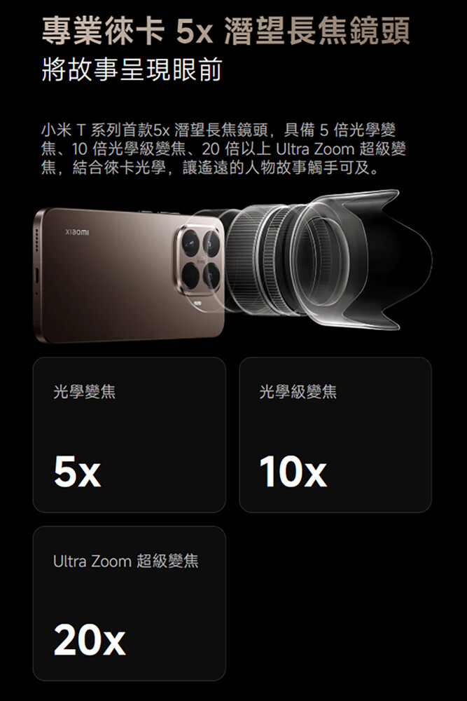 Xiaomi 15T Pro 首度搭載潛望式 5 倍光學長焦鏡頭,不僅支援 5 倍光學變焦、 10 倍光學級變焦與 100 倍數位變焦,當放大至 20 倍以上時,更會自動啟用「Ultra Zoom 2.0 超長焦距」,進一步提升遠距細節表現。在拍攝模式上,全新「大師人像」提供寬銀幕與泡泡景深效果,並允許用戶自由調整焦距與光圈,營造更具層次感的人像氛圍。同時全新的徠卡街拍模式可從鎖定狀態瞬間啟動相機,拍攝支援 28mm、35mm、50mm、75mm 與 135mm 等經典焦段,隨時捕捉靈感來拍出富有電影感的作品。