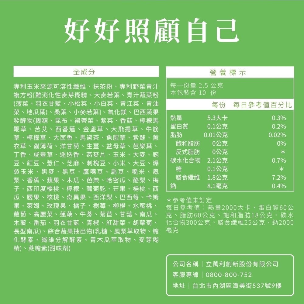 ●內容物成分(如含有豬、牛成分請加註國別):專利玉米來源可溶性纖維、抹茶粉、專利野菜青汁複方粉[難消化性麥芽糊精、大麥若葉、青汁蔬菜粉(菠菜、羽衣甘藍、小松菜、小白菜、青江菜、青油菜、地瓜葉)、桑葉、小麥若葉]、氧化鎂、巴西蔬果發酵物(糊精、昆布、裙帶菜、紫菜、香菇、檸檬馬鞭草、苦艾、西番蓮、金盞草、大飛揚草、牛筋草、檸檬草、大茴香、馬黛茶、魚腥草、紫蘇、薰衣草、貓薄荷、洋甘菊、生薑、益母草、芭樂葉、丁香、咸豐草、迷迭香、燕麥片、玉米、大麥、豌豆、紅豆、薏仁、芝麻、刺槐豆、小米、大豆、爆裂玉米、黑麥、黑豆、鷹嘴豆、扁豆、糙米、鳳梨、香蕉、蘋果、木瓜、芭樂、哈密瓜、酪梨、梅子、西印度櫻桃、檸檬、葡萄乾、芒果、楊桃、西瓜、腰果、核桃、奇異果、西洋梨、巴西莓、卡姆果、萊姆、玫瑰果、橘子、樹莓、柳橙、水蜜桃、蘿蔔、高麗菜、蓮藕、牛蒡、菊苣、甘藷、南瓜、木薯、番茄、羽衣甘藍、青椒、紅甜菜、胡蘿蔔、長型南瓜)、綜合蔬果抽出物(乳糖、鳳梨萃取物、糖化酵素、纖維分解酵素、青木瓜萃取物、麥芽糊精)、蔗糖素(甜味劑)