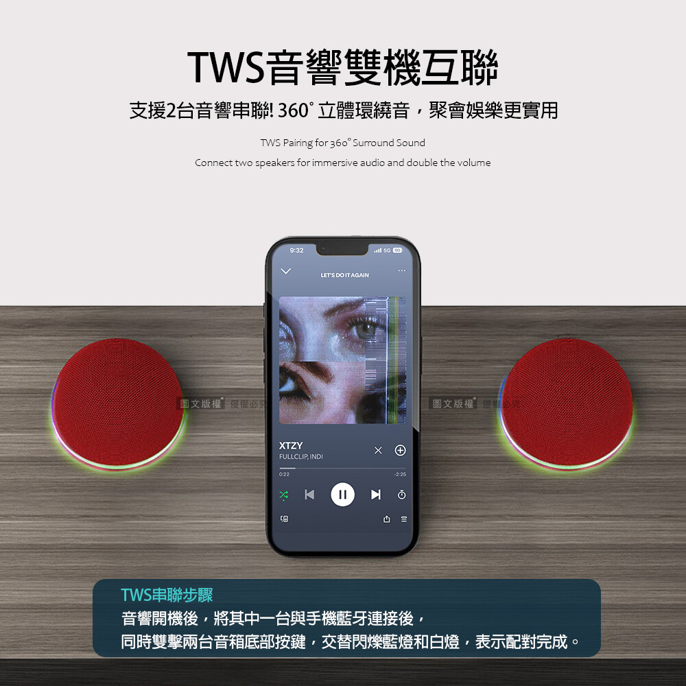 支援TWS無線立體聲環繞音效(TWS需有2台音響才能使用)