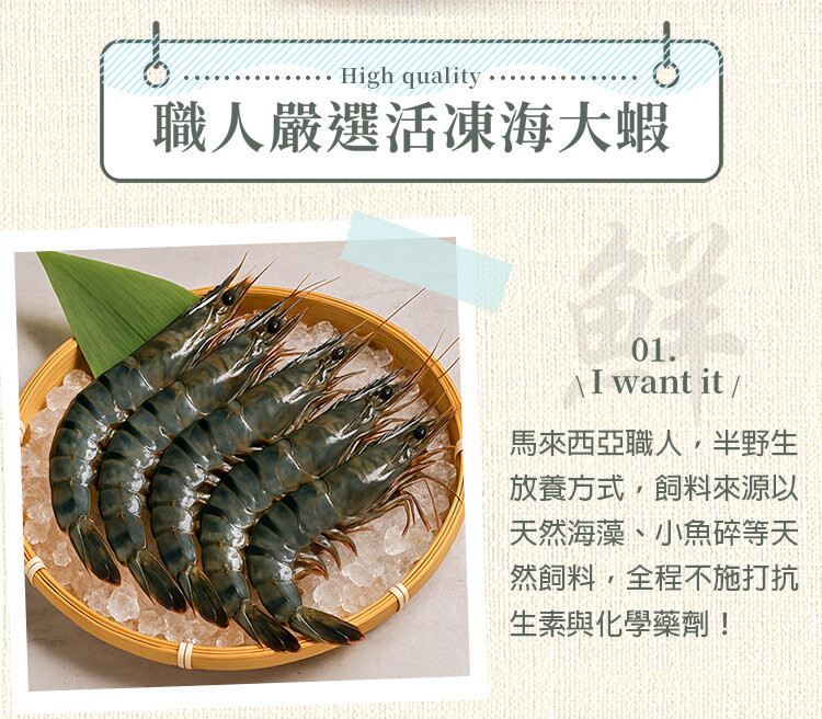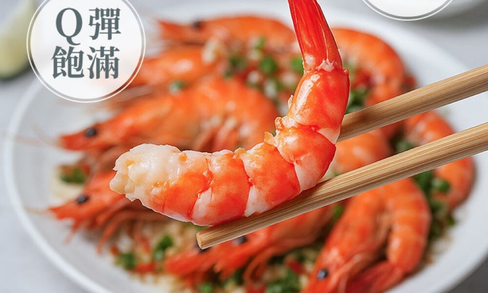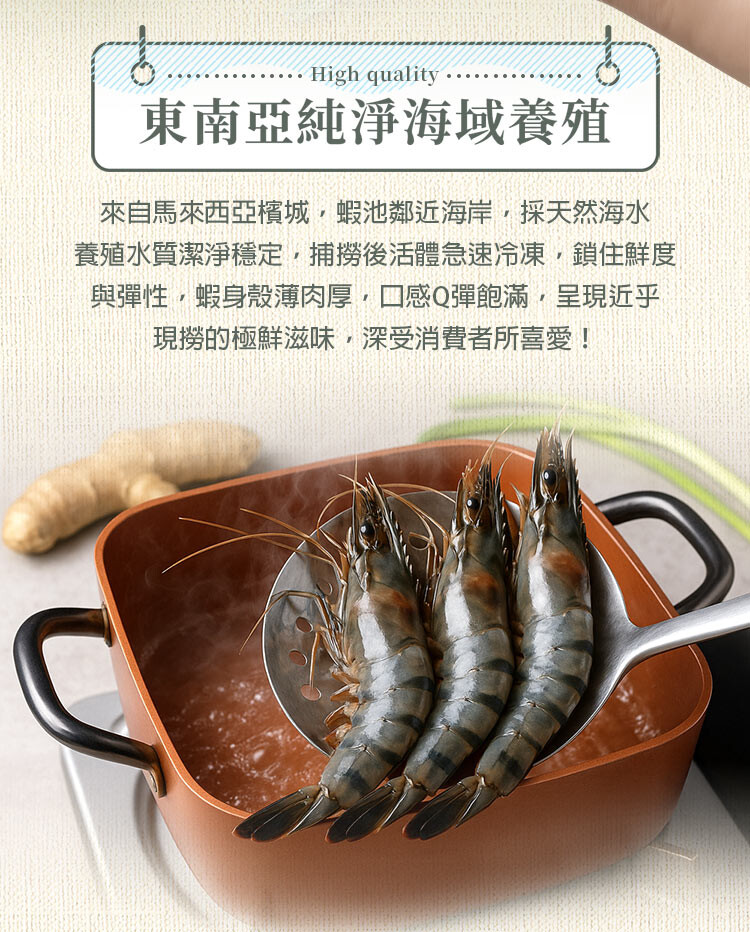 來自馬來西亞檳城,蝦池鄰近海岸,採天然海水養殖,捕撈後活體急速冷凍,鎖住鮮度與彈性,蝦身殼薄肉厚,口感飽滿Q彈!