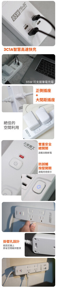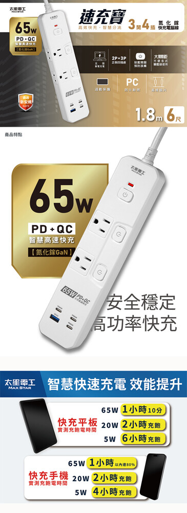 1.智慧高速快充:PD65W快充,Type A+C 四口輸出,支援多設備同時充電,省電省時。