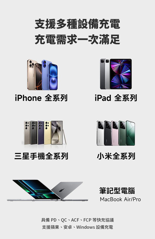 ˙支援手機、平板、筆電多種設備充電需求
