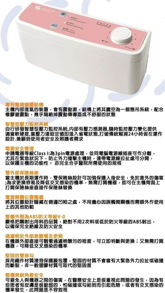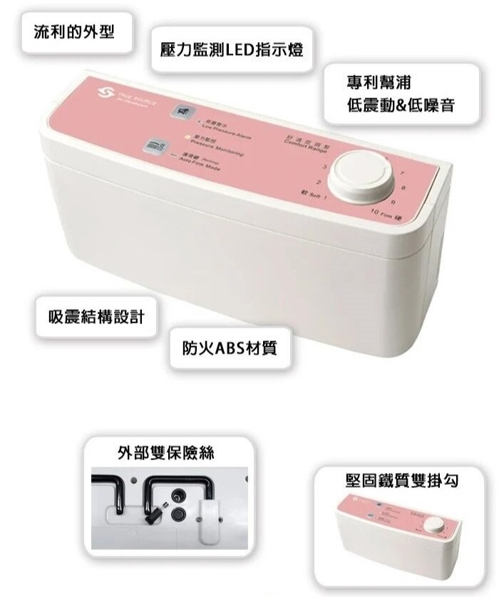 ◆ 專利幫浦避震結構/智慧型壓力監控系統/整機外殼為ABS防火等級V-0