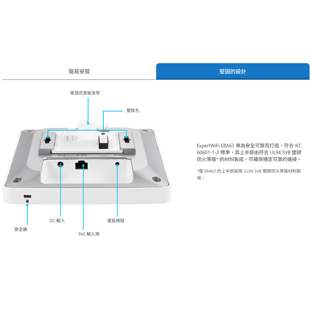-專為安全可靠而打造 : EBA63符合IEC 60601-1-2標準,裝置上半部由符合UL94 5VB塑膠防火等級的材料製成,可確保穩定可靠的連接。