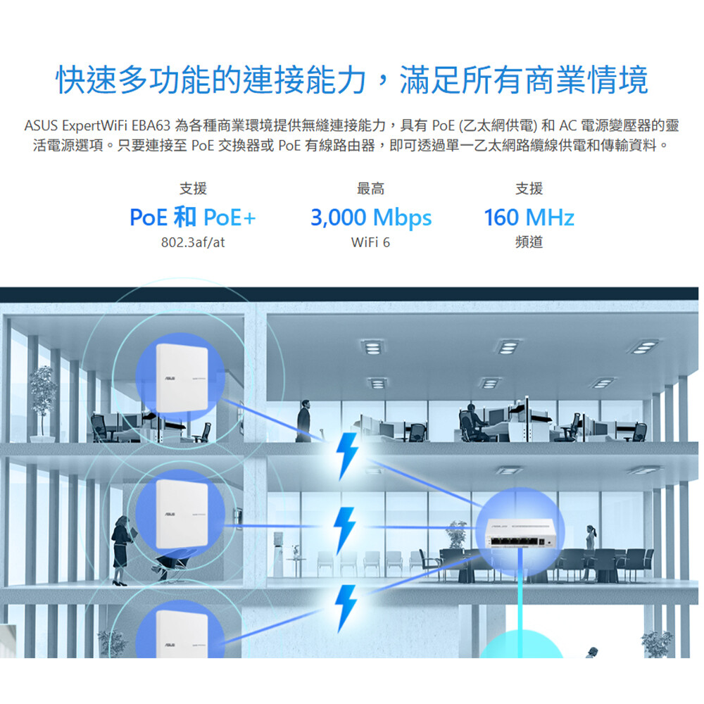 -無縫且可擴展的連線 : 以高達3000 Mbps的WiFi 6速度享受無間斷的漫遊,最高支援100部主動裝置,並且可輕鬆擴充,滿足您的企業網路不斷變化的需求。