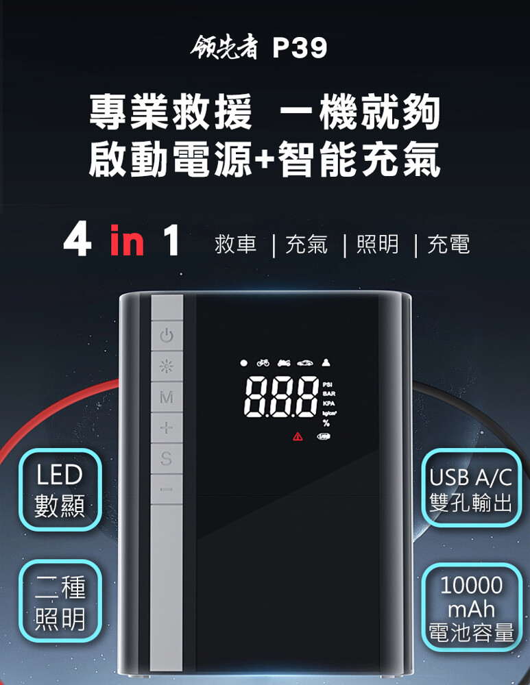 .產品內容:P39打氣機x1、智能救車線x1、充氣嘴轉換頭x1、氣針x1、法式氣嘴x1、氣管x1、Type-C充電線x1、絨布收納袋x1、說明書x1