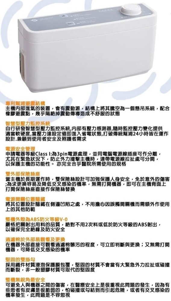 ◆ 專利幫浦避震結構/智慧型壓力監控系統/整機外殼為ABS防火等級V-0