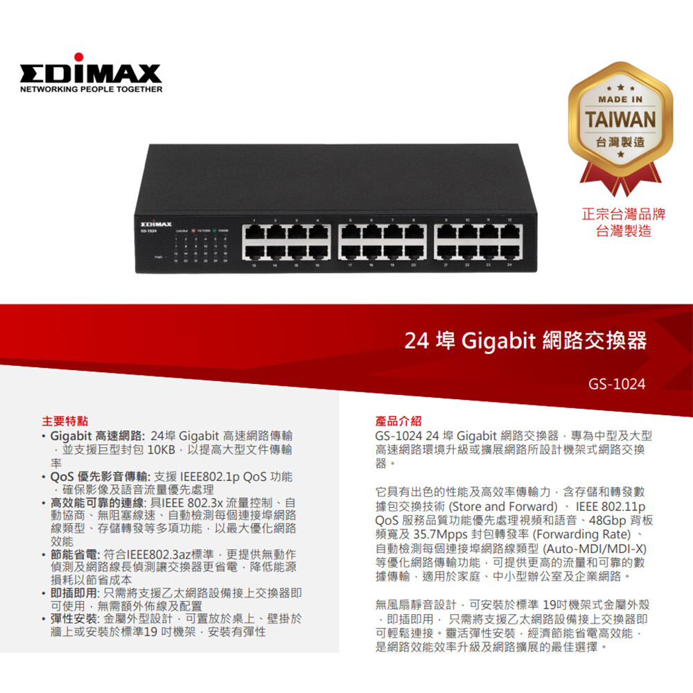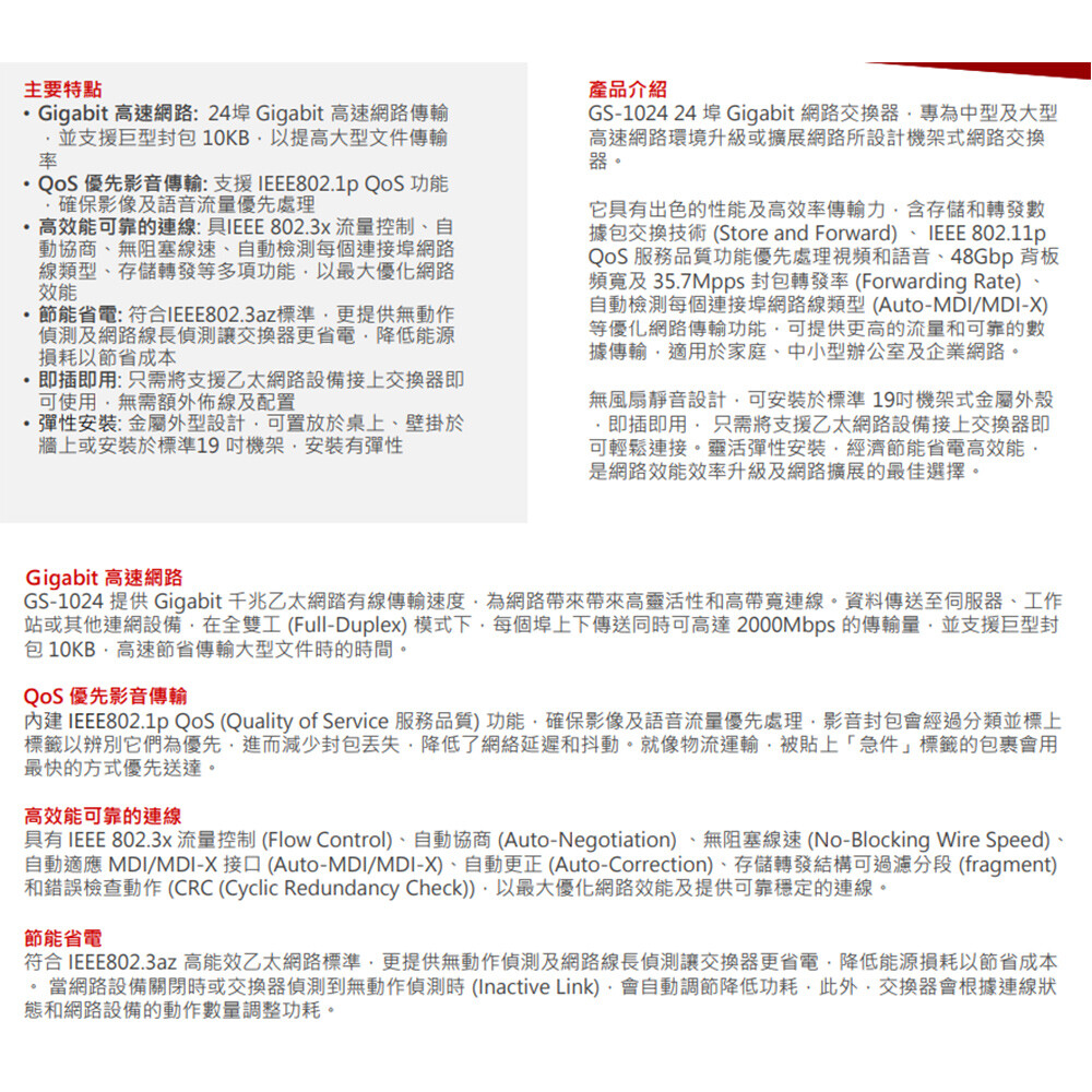 -Gigabit高速網路 : 24埠Gigabit高速網路傳輸,並支援巨型封包10KB,以提高大型文件傳輸率。