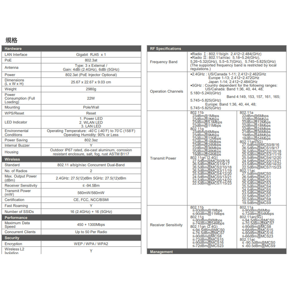 -無線訊號覆蓋範圍廣.接收靈敏度高 : 可調整RF輸出功率和高接收靈敏度,無線訊號覆蓋範圍廣,對於需求佈建 長距廣域的無線環境而言,尤其適合。