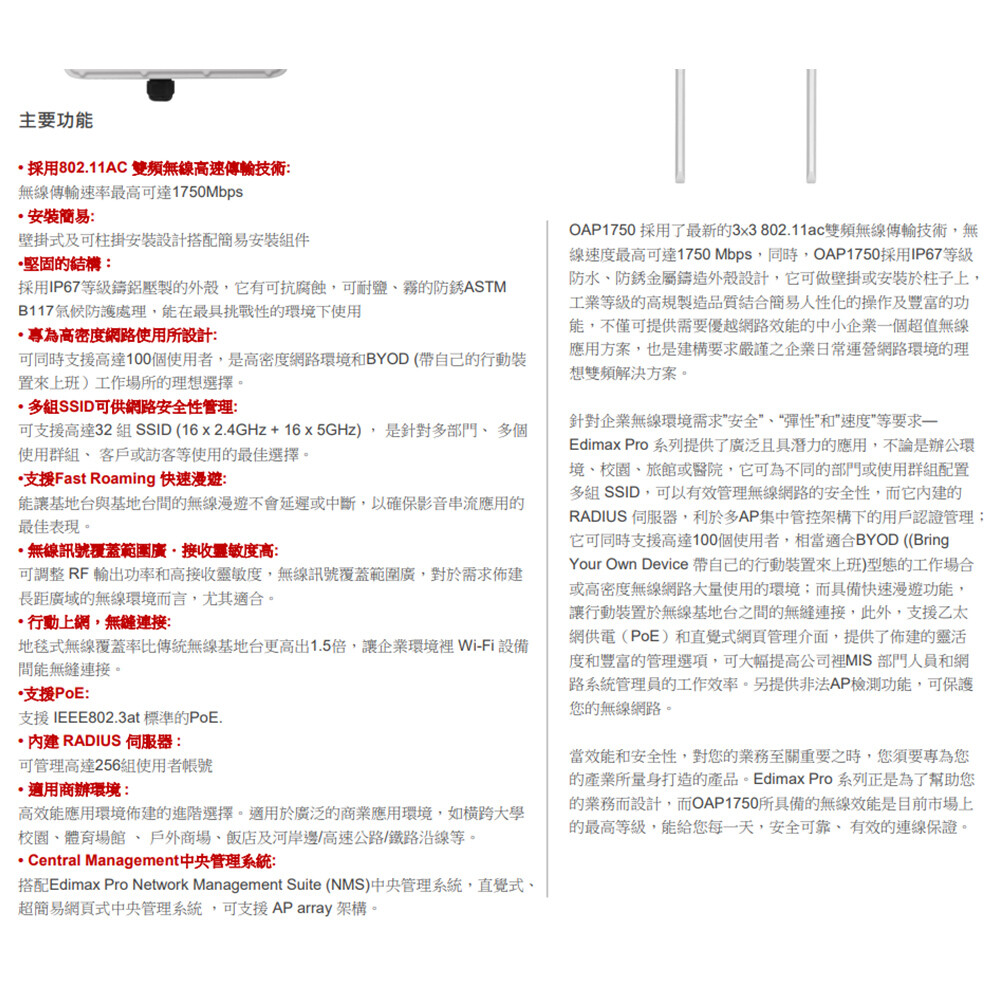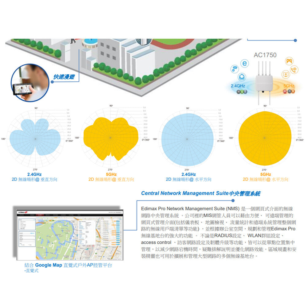 -Central Management中央管理系統 : 搭配Edimax Pro Network Management Suite (NMS)中央管理系統,直覺式、超簡易網頁式中央管理系統,可支援AP array 架構。