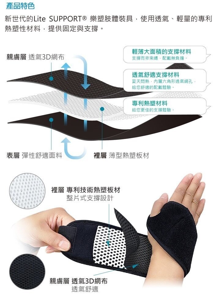 ◆ Lite SUPPORT樂塑手護系列由獨家專利熱塑性材料與輕膚網布製作而成