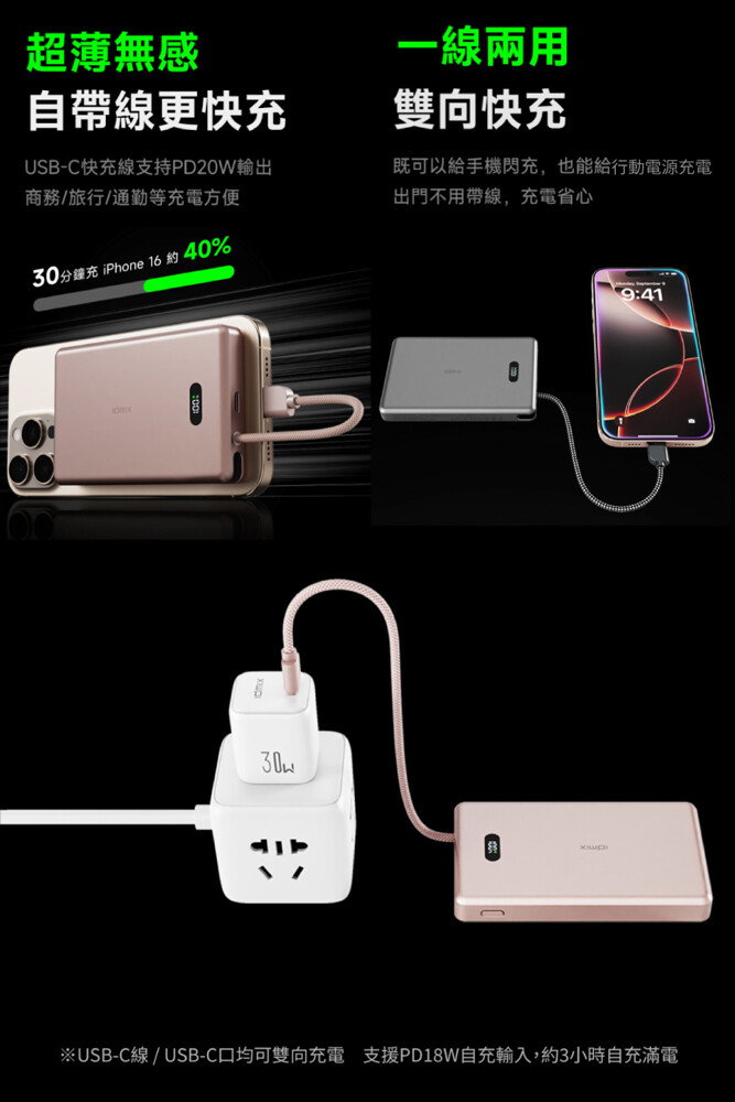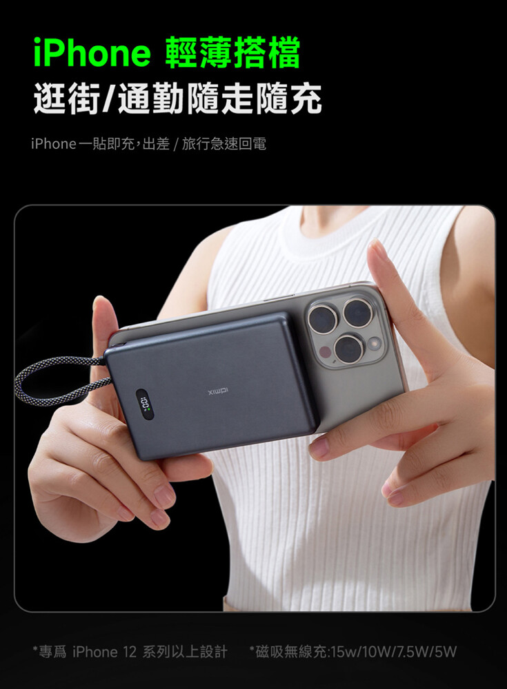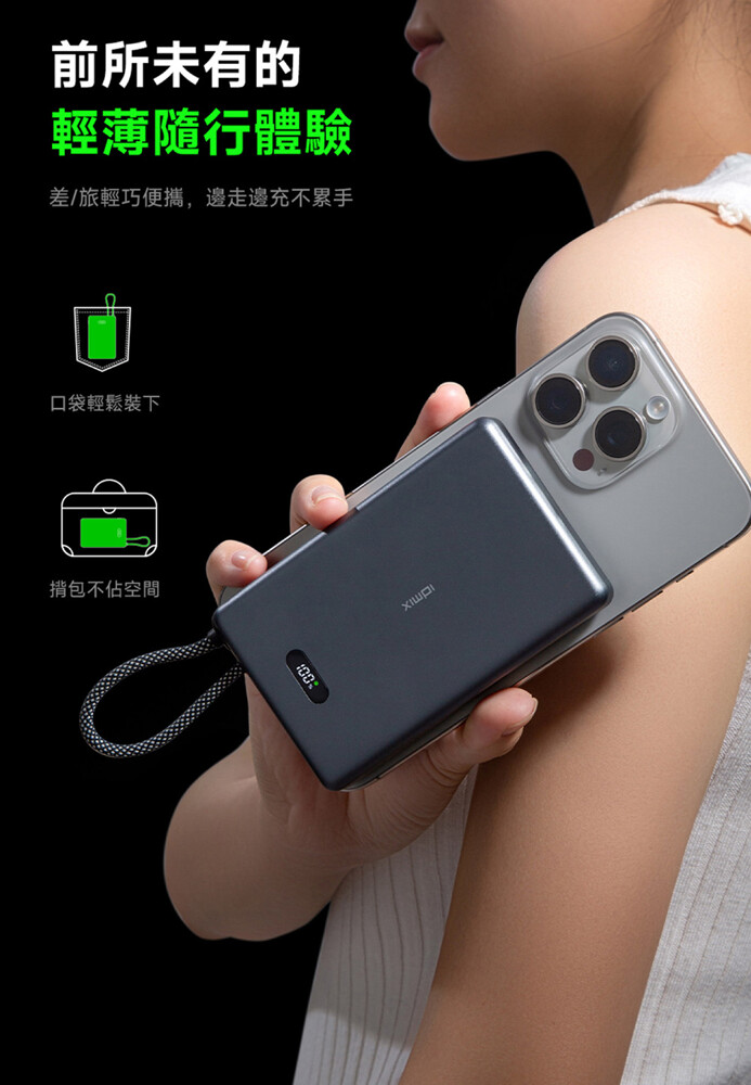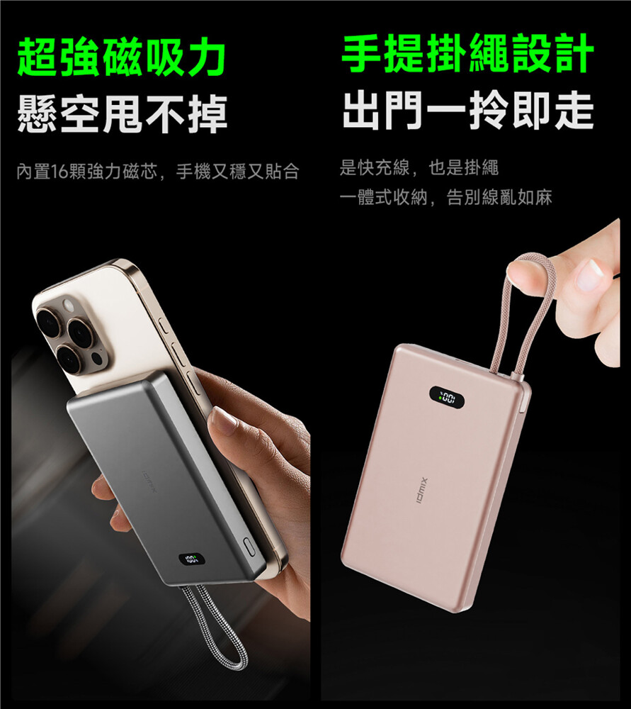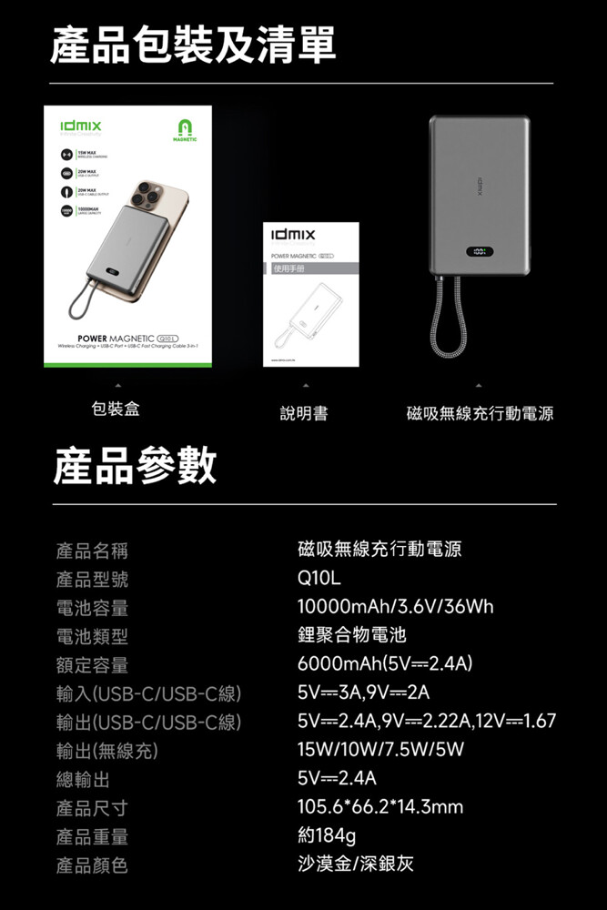 idmix 自帶USB-C線 磁吸無線充行動電源Q10L