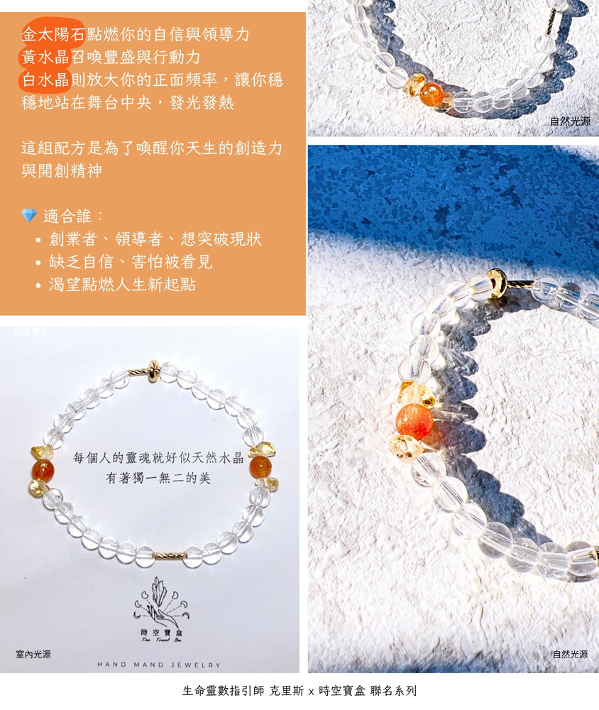 金太陽石點燃你的自信與領導力,黃水晶召喚豐盛與行動力,白水晶則放大你的正面頻率,讓你穩穩地站在舞台中央,發光發熱。這組配方是為了喚醒你天生的創造力與開創精神。