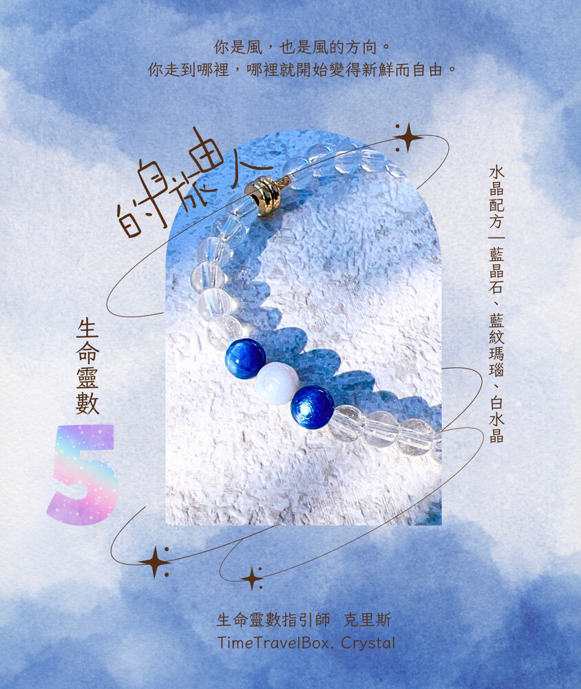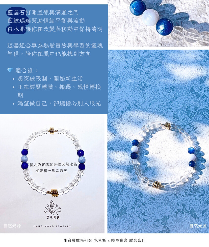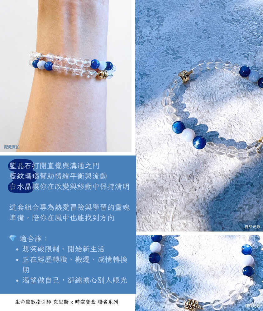 藍晶石打開直覺與溝通之門,藍紋瑪瑙幫助情緒平衡與流動,白水晶讓你在改變與移動中保持清明。這套組合專為熱愛冒險與學習的靈魂準備,陪你在風中也能找到方向。