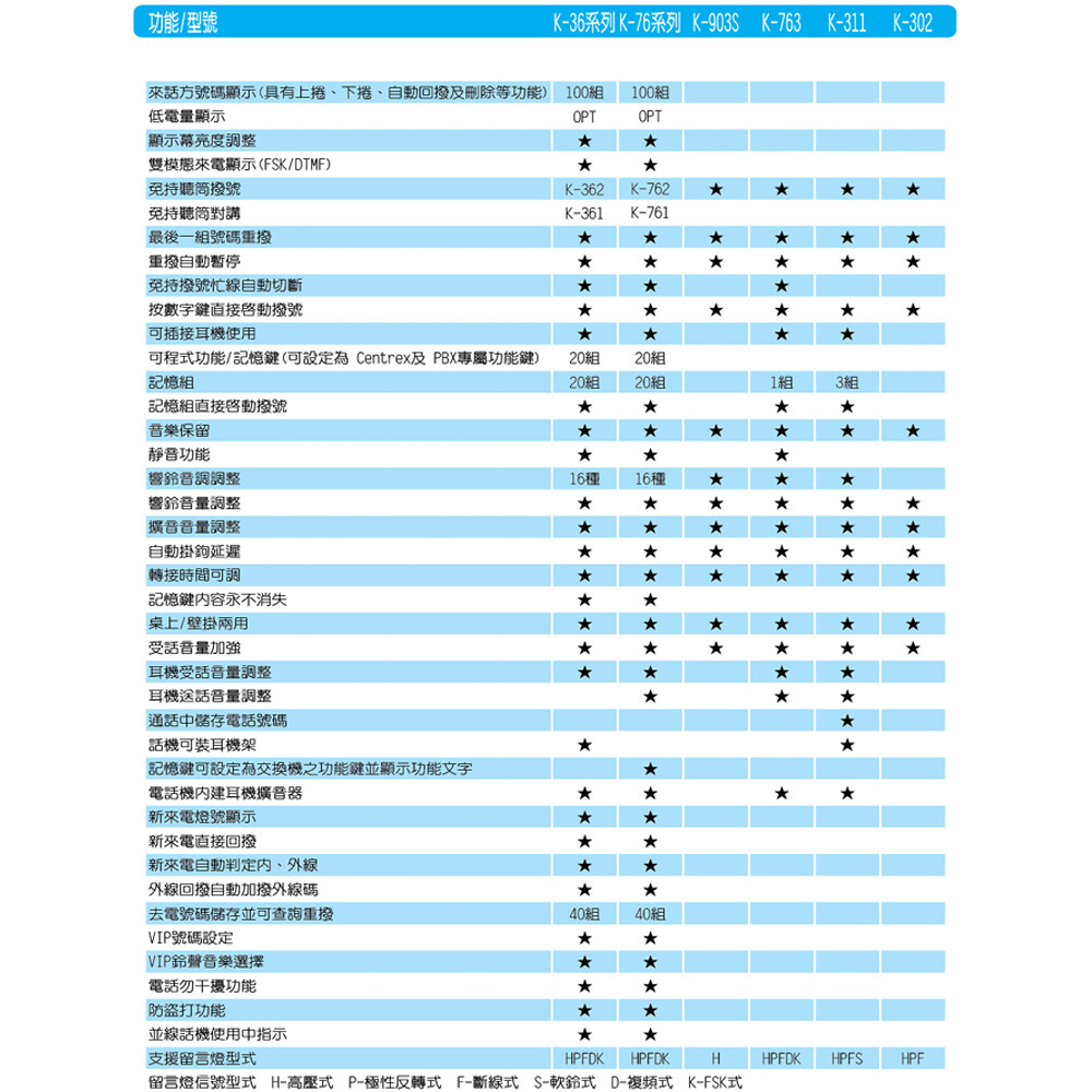 具來電顯示功能(FSK/DTMF 雙模),可動態儲存最多100組來電號碼