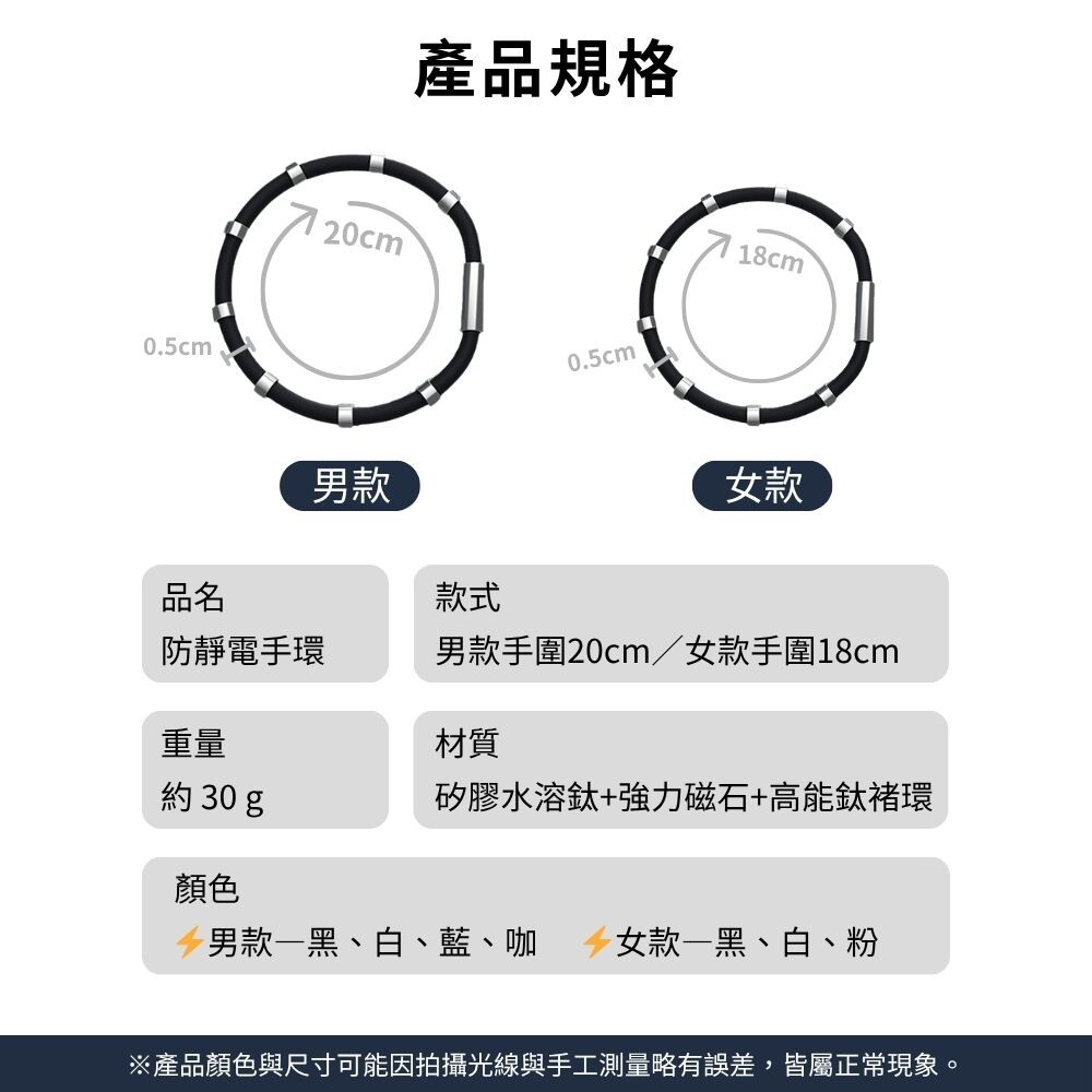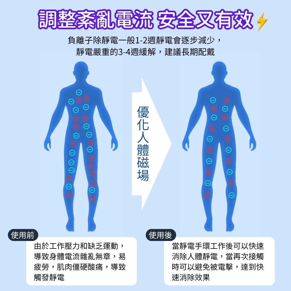 內含防靜電粒子與高能鈦褚環,能中和體內靜電,1–2 週明顯改善,長期配戴更穩定