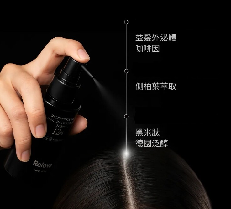 步驟二:將養髮液均勻搖勻後,噴灑於整頭或欲加強的部位,並以指腹輕柔按摩至吸收。