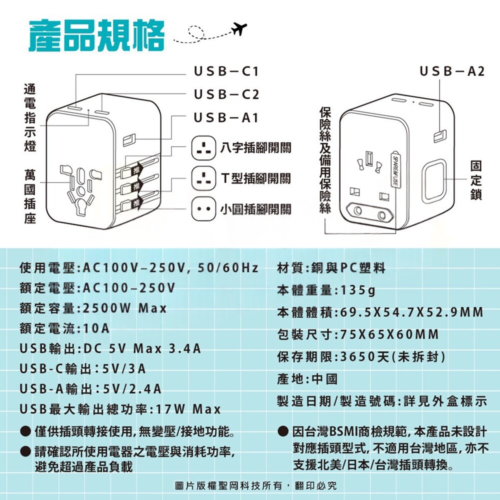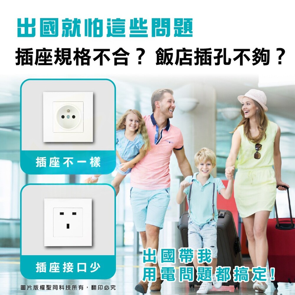 🔺多國轉接插座獨立使用時無變壓功能, 使用前請注意電器原電壓規格是否與當地電壓相同. 如不相同, 請勿插入設備使用! 若因此造成設備損壞, 此為人為使用疏失, 非產品保固或保障範圍.
