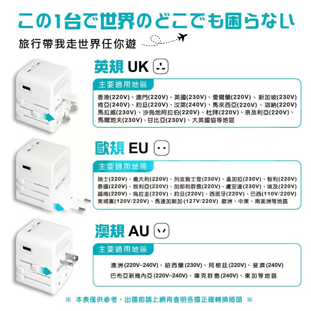🔹充電器適用國際電壓100V~240V, 無需使用變壓器 (註: 多國轉接插座獨立使用時無變壓功能, 使用前請注意電器原電壓規格是否與當地電壓相同. 如不相同, 請勿插入設備使用!)