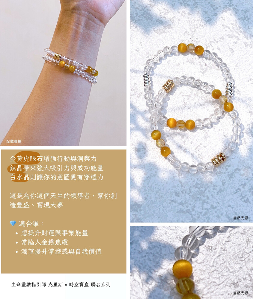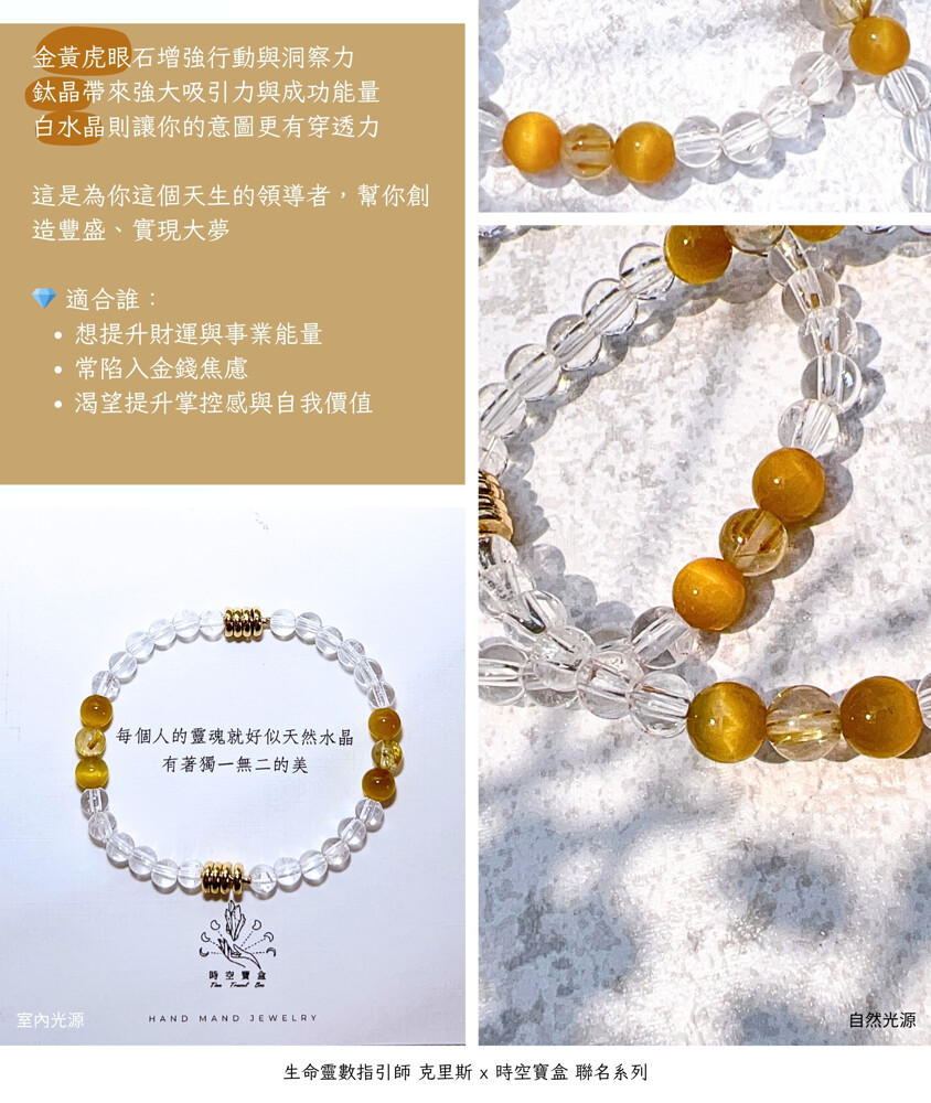 金黃虎眼石增強行動與洞察力,鈦晶帶來強大吸引力與成功能量,白水晶則讓你的意圖更有穿透力。這是為你這個天生的領導者,幫你創造豐盛、實現大夢。
