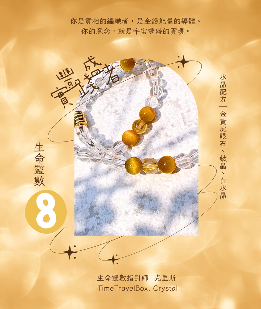 8號是權力、金錢與實現願望的符號。這條水晶手鍊為你召喚穩健的財富流動與實踐力,幫助你在物質與心靈之間找到平衡。