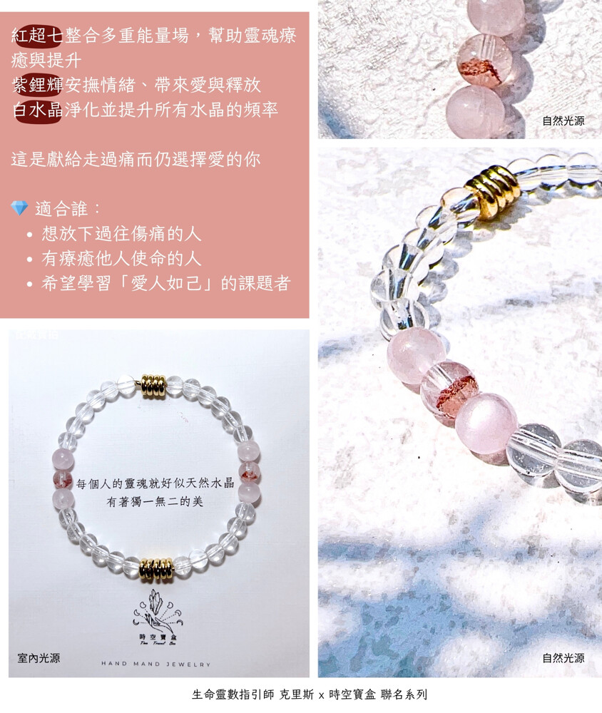 紅超七整合多重能量場,幫助靈魂療癒與提升;紫鋰輝安撫情緒、帶來愛與釋放,白水晶淨化並提升所有水晶的頻率。這是獻給走過痛而仍選擇愛的你。
