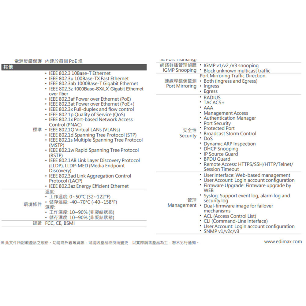 -智慧Layer 2網路管理支援SNMP v1/v2c/v3, Access Control List (ACL), QoS,802.1Q VLAN, IPv4/IPv6, Port Trunking, Port Mirroring, IGMP v1/v2/v3 Snooping等等。