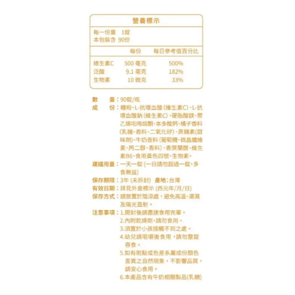 4.內容物成分(如含有豬、牛成分請加註國別):糖粉、L-抗壞血酸(維生素C)、L-抗壞血酸鈉(維生素C)、硬脂酸鎂、聚乙烯☆咯烷酮、本多酸鈣、橘子香料(乳糖、二氧化矽、香料)、蔗糖素(甜味劑)、牛奶香料(葡萄糖、微晶纖維素、丙二醇、香料)、香莢蘭醛、維生素B6、食用黃色四號、生物素