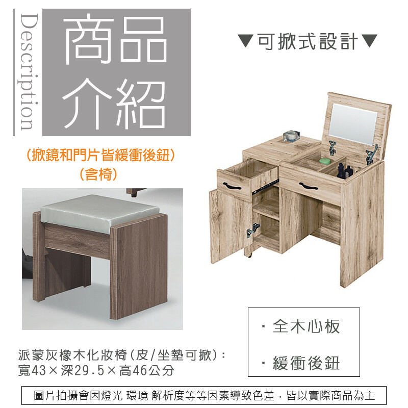 《奈斯家具Nice》500-4-HT 派蒙灰橡木2.7尺掀鏡台/含椅