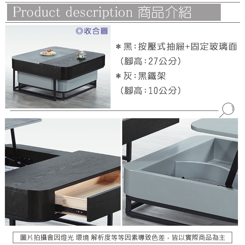 黑:按壓式抽屜+固定玻璃面(腳高:27公分)