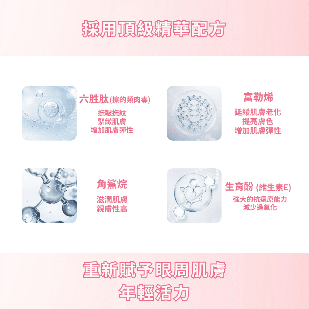 功效:調節眼睛四周乾燥,,緊緻、撫紋撫皺、使肌膚呈現水嫩透亮。
