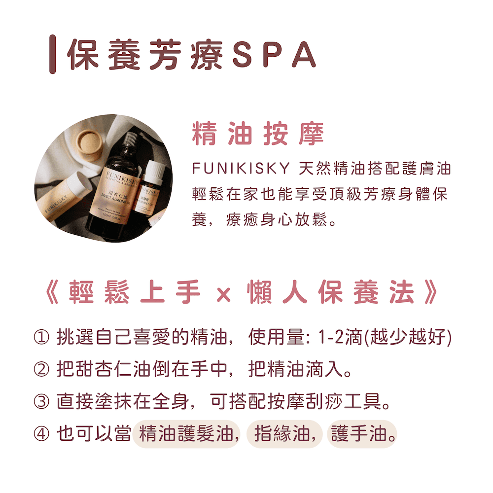 搭配甜杏仁油按摩全身,可舒緩疲勞的肌肉及身心,出外踏青也可防蚊驅蟲。