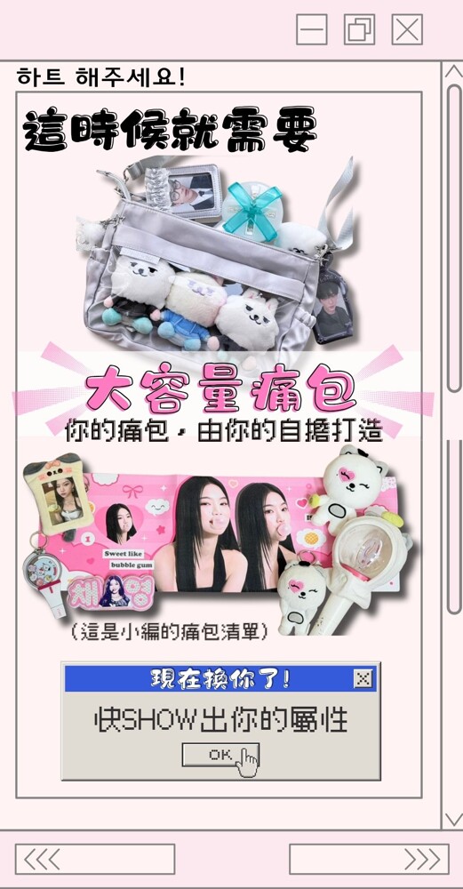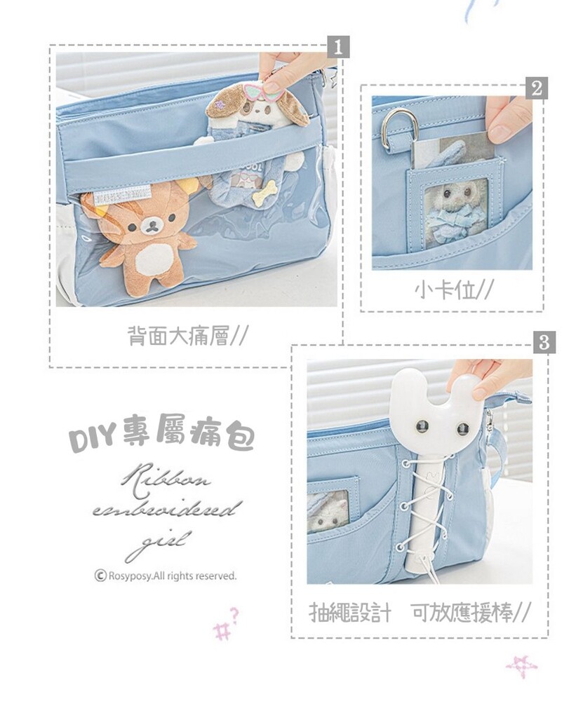 我們相信,每個追星的你,都應該光彩奪目地展示屬於自己的故事。 雙面痛窗設計:正反都能展示,翻面就可以換造型。 專屬小卡收納:透明卡位,隨時展現本命。 應援棒專用抽繩位:輕鬆插入,不怕撞到或壓壞。 多掛勾設計:吊飾、徽章、娃娃一次掛滿。