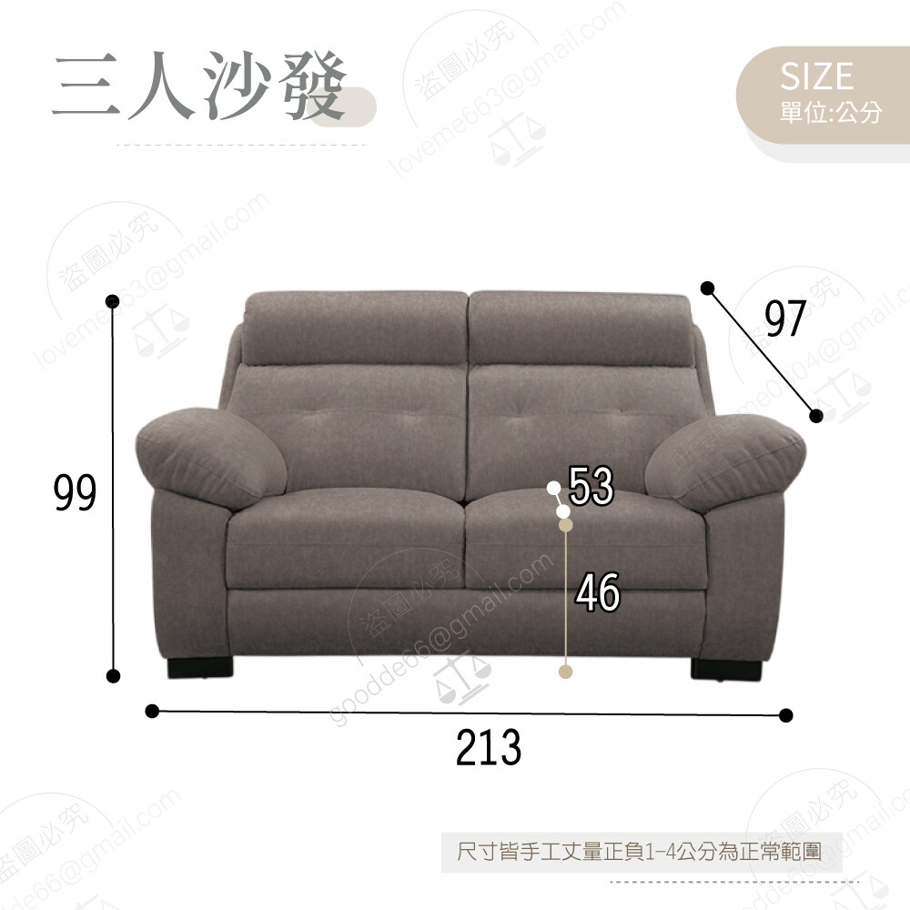 三人沙發:寬213×深97×高99公分