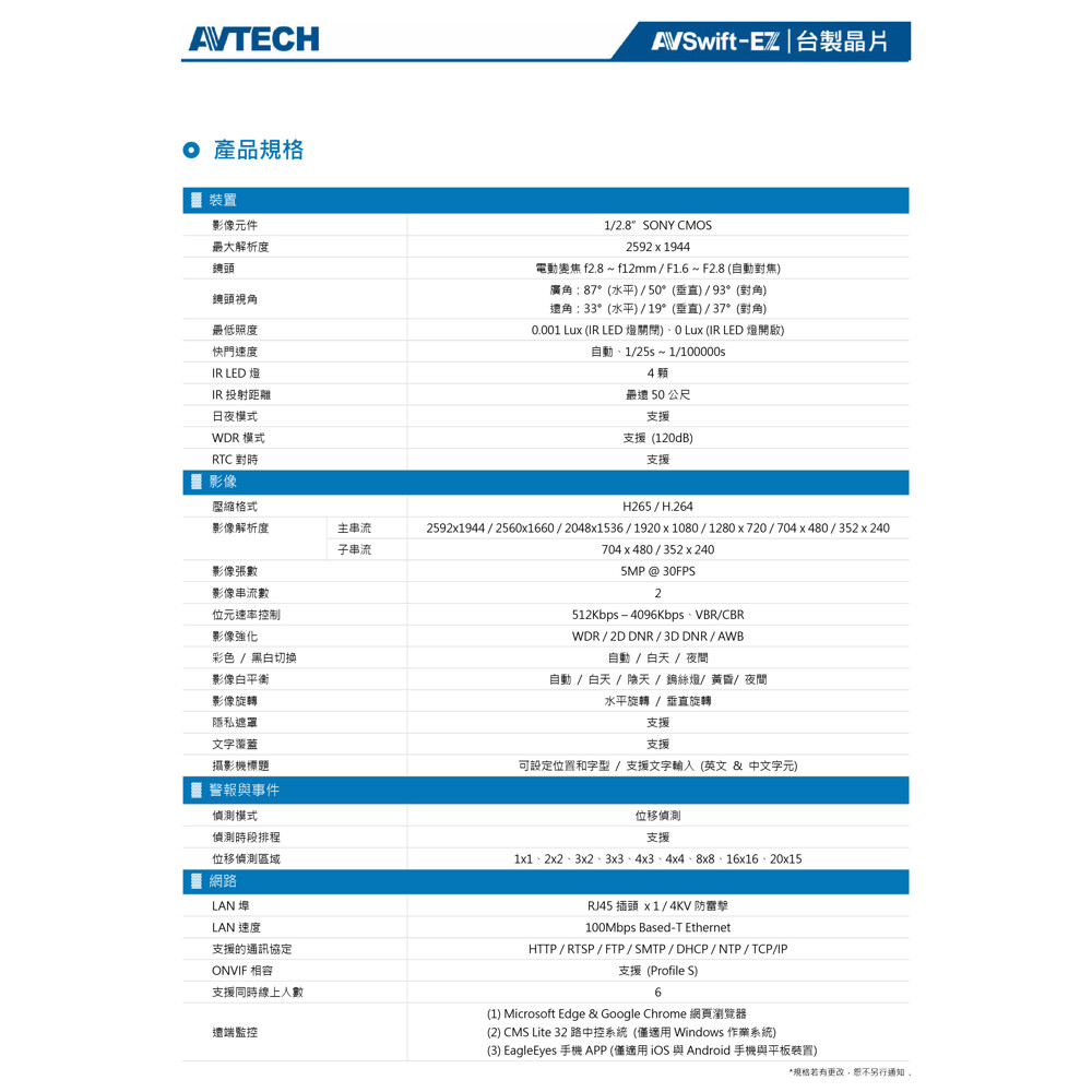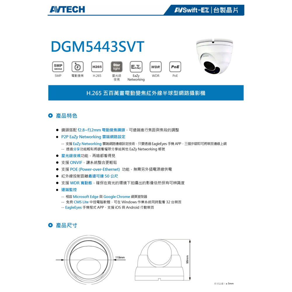 昌運監視器 AVTECH陞泰 DGM5443SVT 500萬畫素 電動變焦紅外線半球型網路攝影機