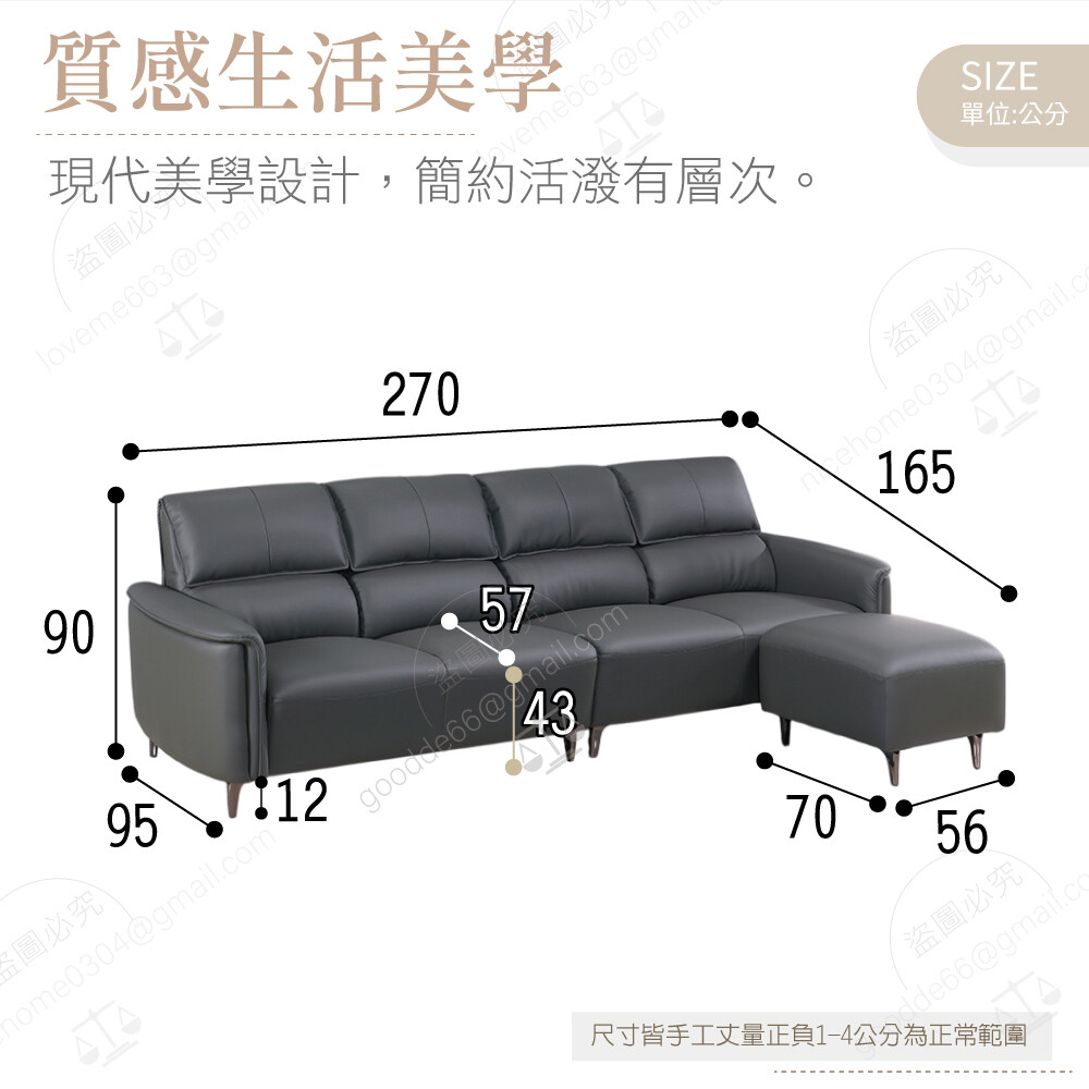 四人沙發:寬270×深95×高90公分