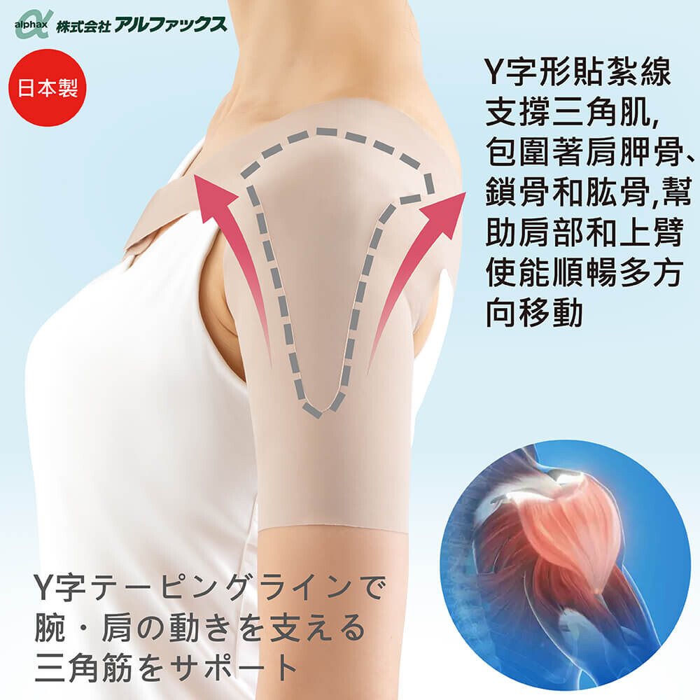 4. 調整Y字貼紮線至上臂包覆肩部肌肉。