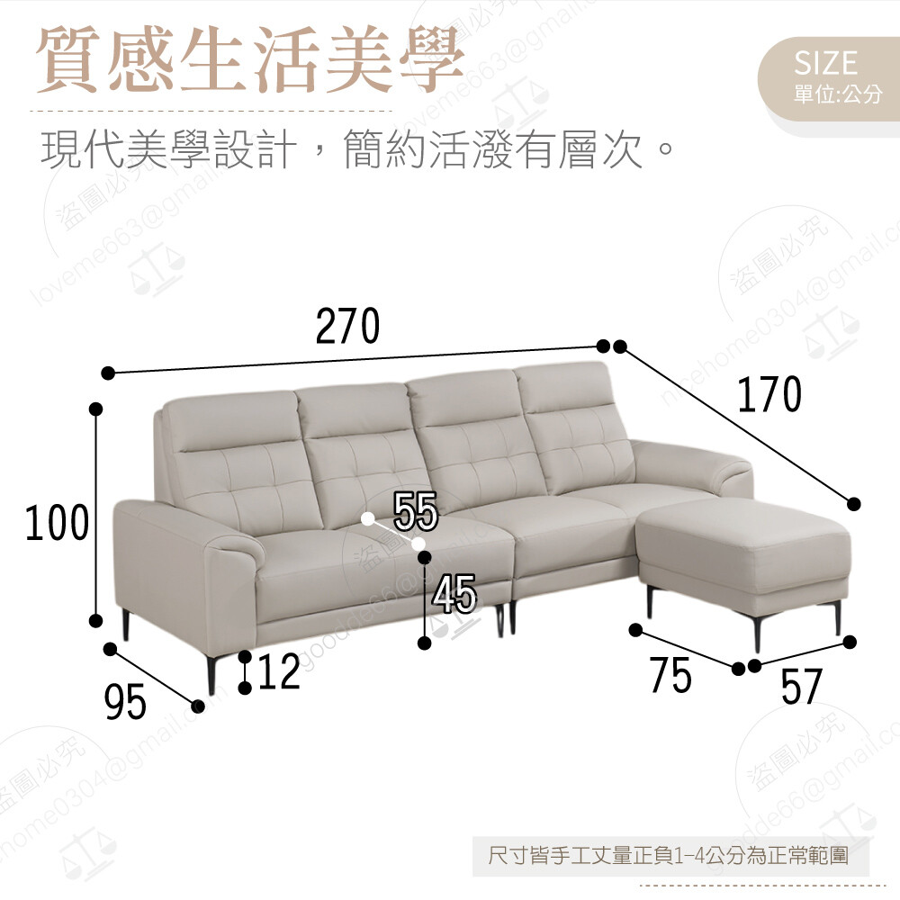 四人沙發:寬270×深95×高100公分
