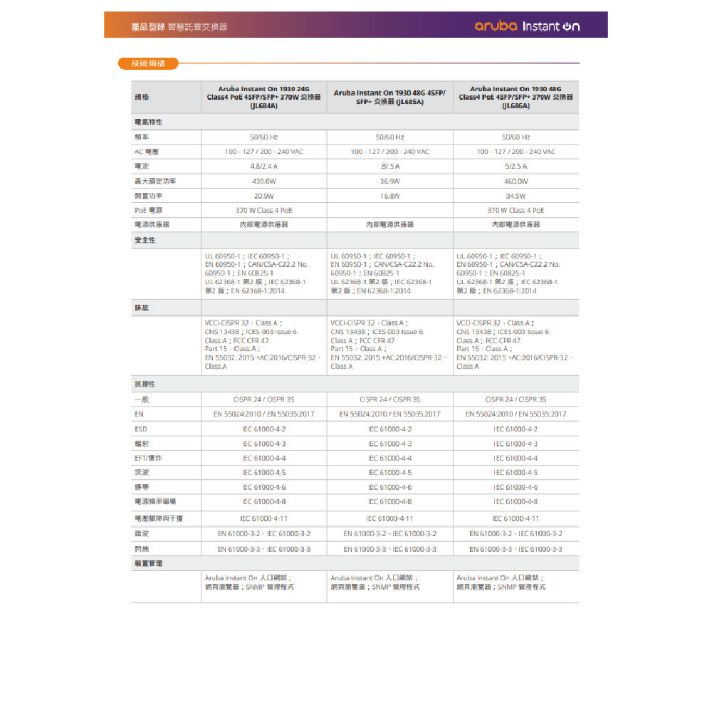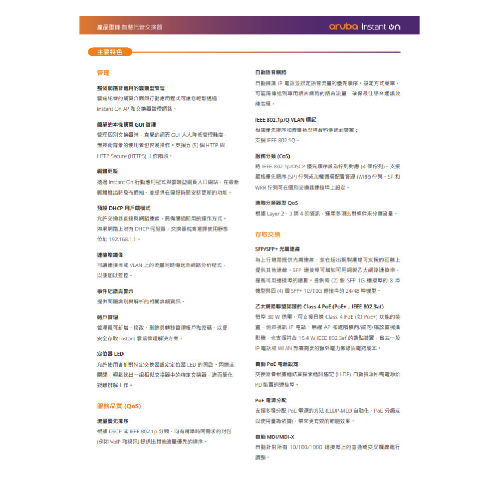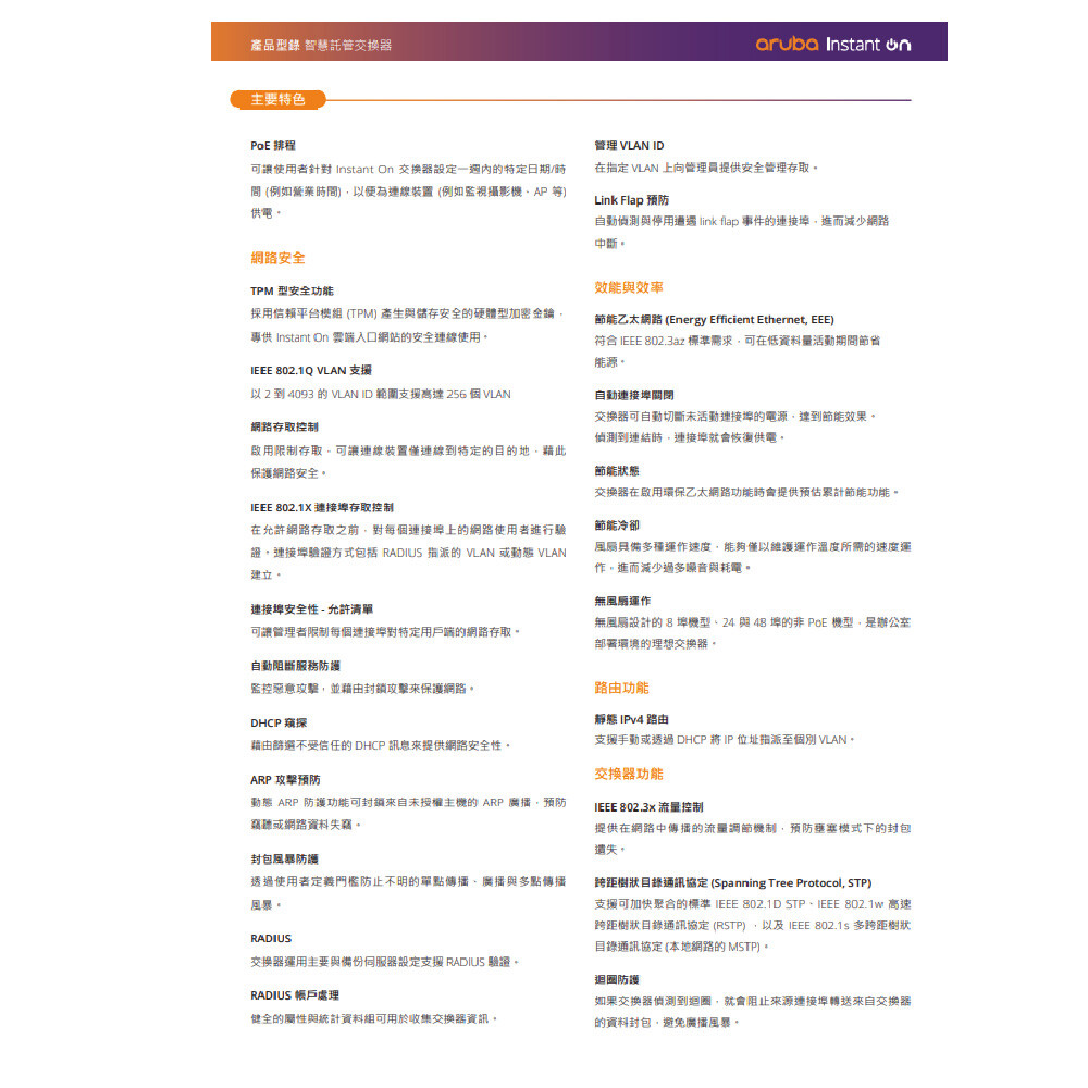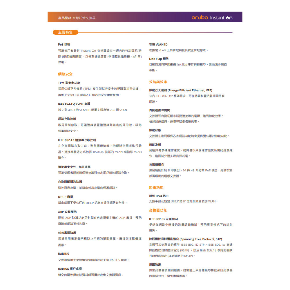 內建安全防護:具備安全控制功能,可透過IEEE 802.1X、VLAN、網路存取控制(ACL) 等技術,保護網路免於未經授權的存取。