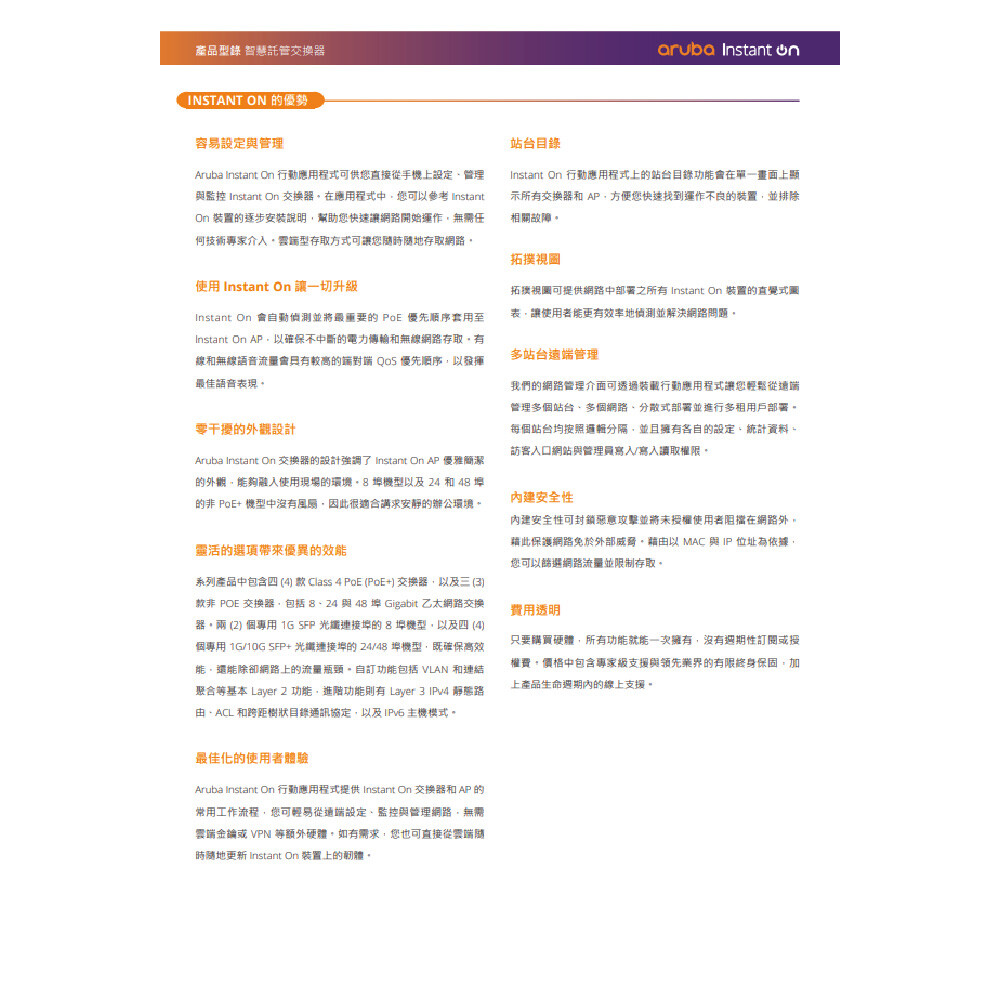 易於管理:使用者可透過Instant On 行動應用程式或雲端網頁入口網站,隨時隨地快速設定、監控和管理交換器。