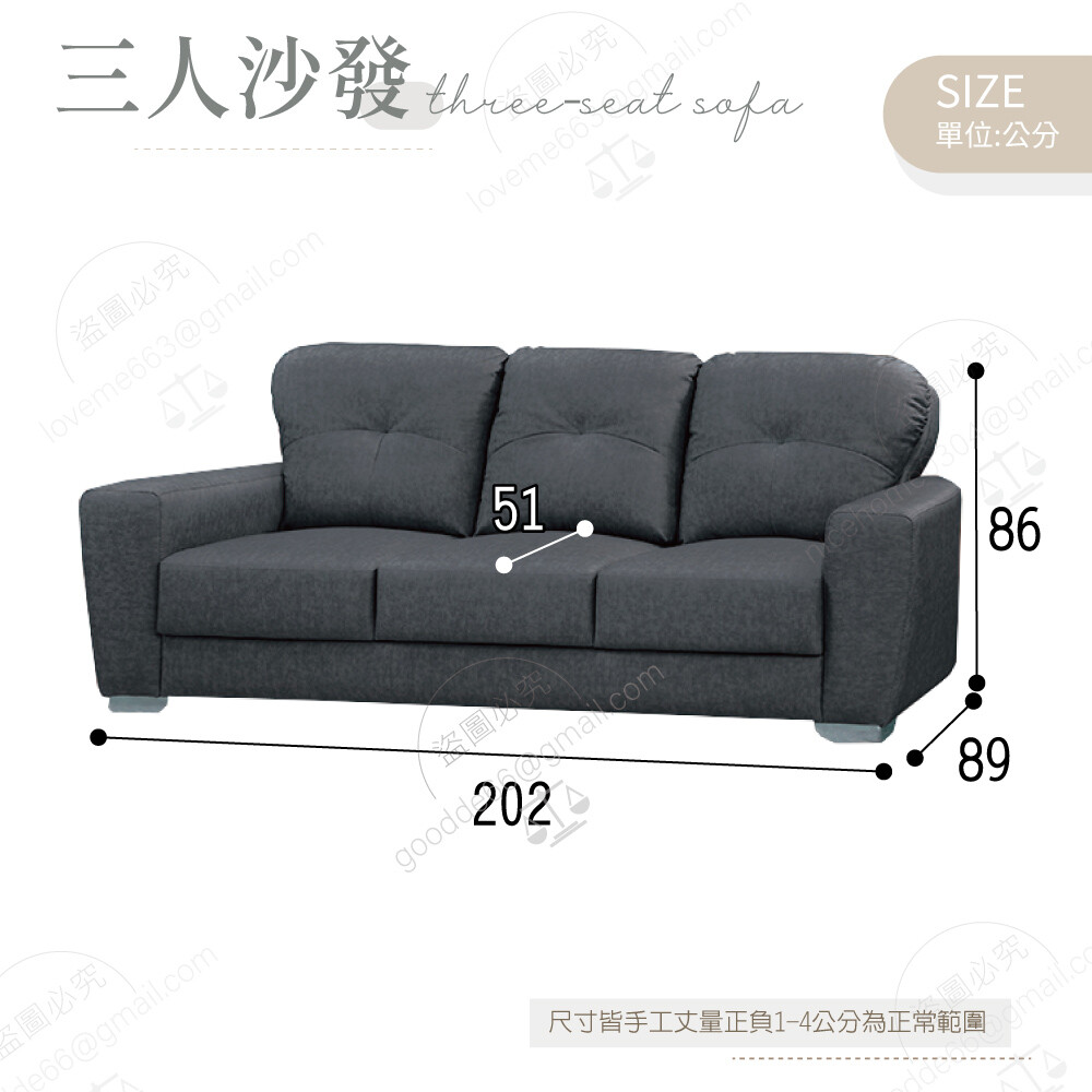 三人沙發:寬202×深89×高86公分
