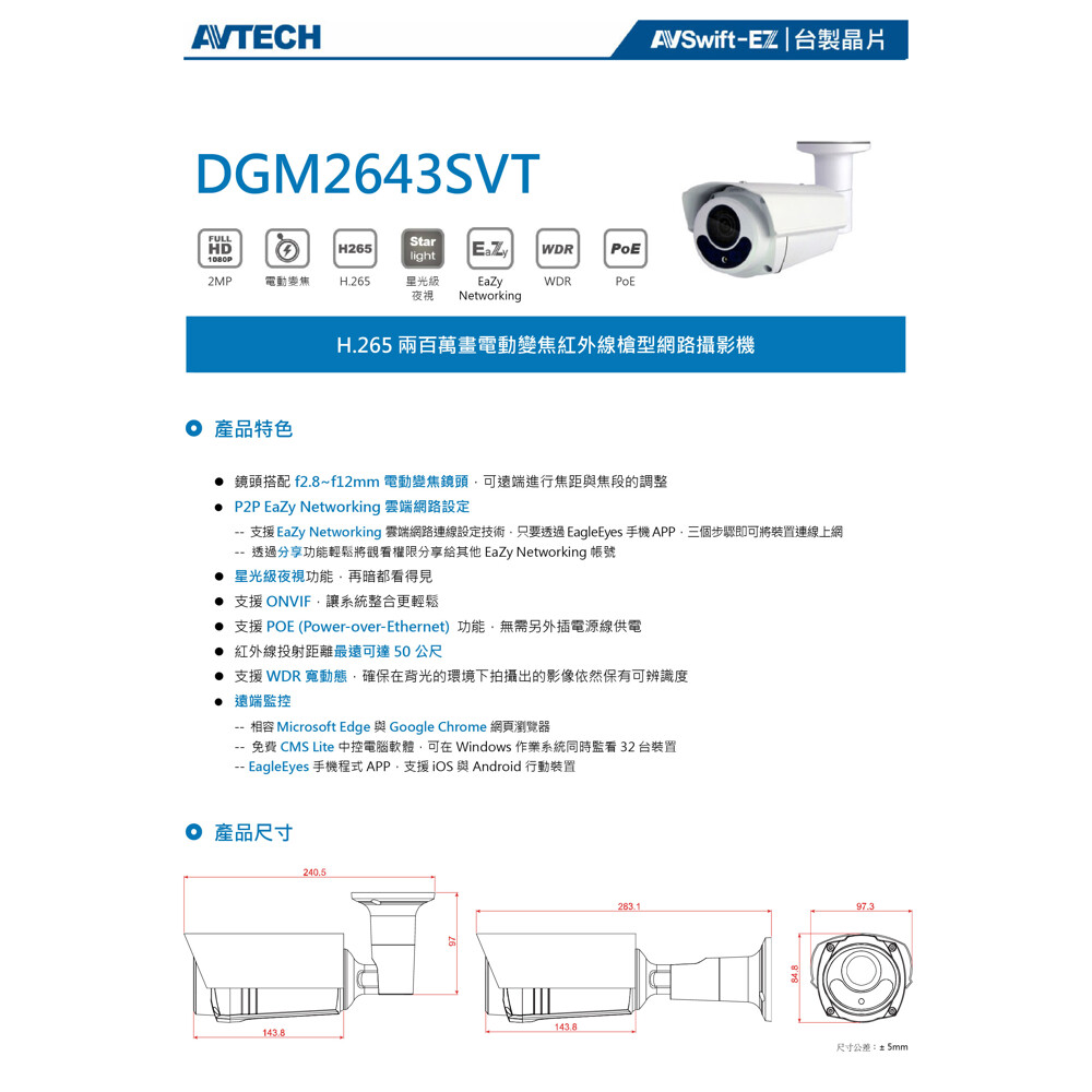昌運監視器 AVTECH陞泰 DGM2643SVT 200萬畫素 電動變焦紅外線槍型網路攝影機