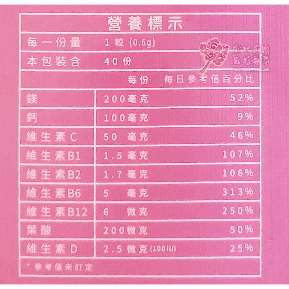 成分 : 專利型態螯合鎂、檸檬酸鎂、檸檬酸鈣、維生素C、維生素B12、維生素B2、維生素B6、葉酸、維生素D
