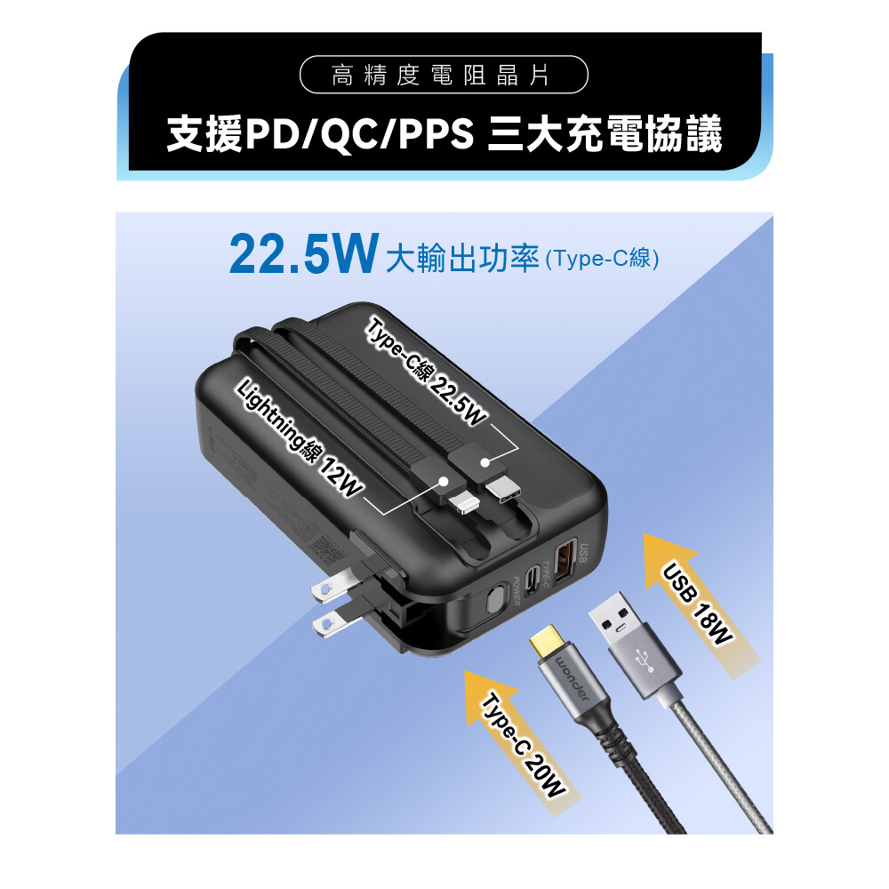 🔹Type-C線輸出:5V⎓3A, 9V⎓2.22A,10V⎓2.25A, 12V⎓1.67A(22.5W MAX)/Lightning線輸出:5V⎓2.4A(12W MAX)