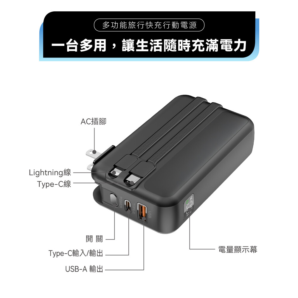 🔹多口輸出:USB-A+ Type-C+ Type-C線+ Lightning線合計最大輸出5V⎓1A(5W)