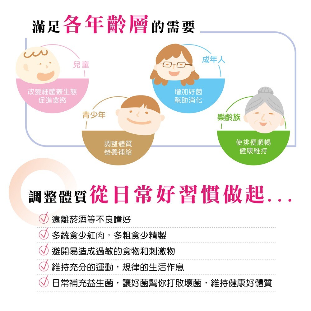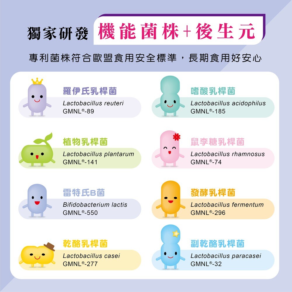 ★多元菌株和後生元組合,幫助改變細菌叢生態,維持消化道機能。