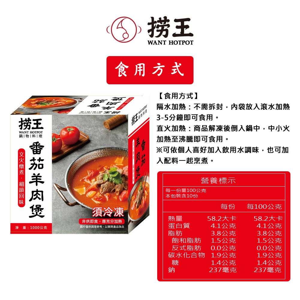 成份、食品添加物名稱:水、羊肉、大豆沙拉油、番茄糊、糖、雞粉{鹽、調味劑 (L-麩酸鈉、胺基乙酸、琥珀酸二鈉、5´-次黃嘌呤核苷磷酸二鈉、5´-鳥嘌呤核苷磷酸二鈉)、糖、麥芽糊精、雞肉粉[含雞肉、調味劑(DL-胺基丙酸)]、雞油[含抗氧化劑(維生素E)]、木糖酵母粉、洋蔥粉、品質改良劑(二氧化矽)、香料}、鹽、大骨粉{鹽、調味劑 (L-麩酸鈉、胺基乙酸、琥珀酸二鈉、5´-次黃嘌呤核苷磷酸二鈉、5´-鳥嘌呤核苷磷酸二鈉)、麥芽糊精、糖、豬肉粉〔乳糖、醬油粉、植物水解蛋白(大豆、玉米、小麥)、調味劑(DL-胺基丙酸)、芥花油、豬肉抽出物(含豬骨)、葡萄糖、D-木糖〕、洋蔥粉、品質改良劑(二氧化矽)、香料、甘草、薑母、當歸(調味用)、白胡椒}、蒜粉[蒜粉、品質改良劑(二氧化矽)]、洋蔥粉[洋蔥粉、品質改良劑(二氧化矽)]、五香粉(小茴香、肉桂、八角、胡荽、丁香)、老抽(水、大豆、糖、鹽、小麥麵粉、米麴菌)、八角粉、仙楂粉、桂皮粉、花椒