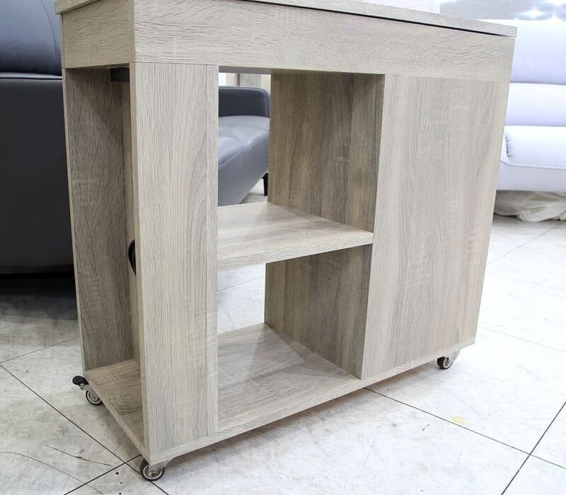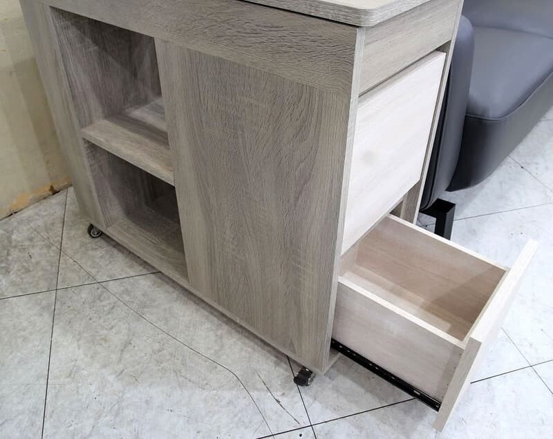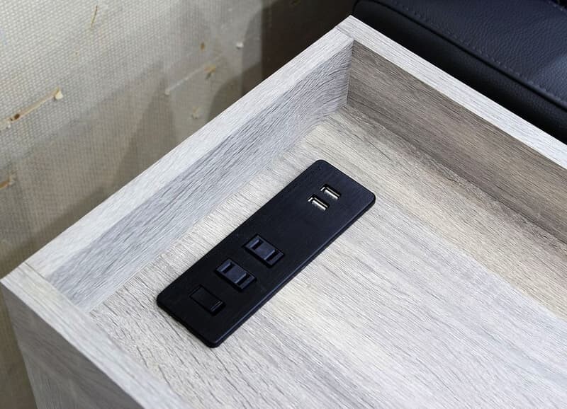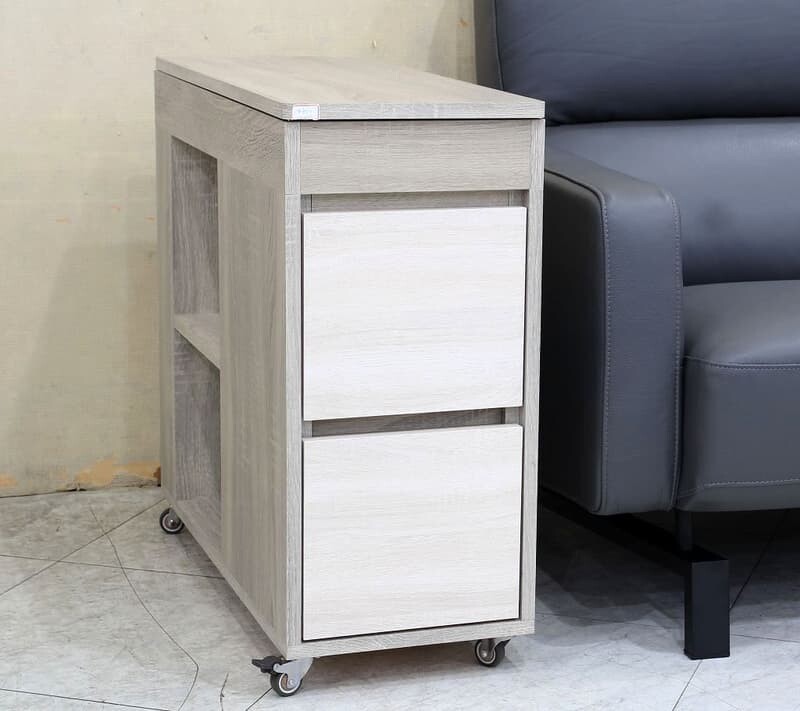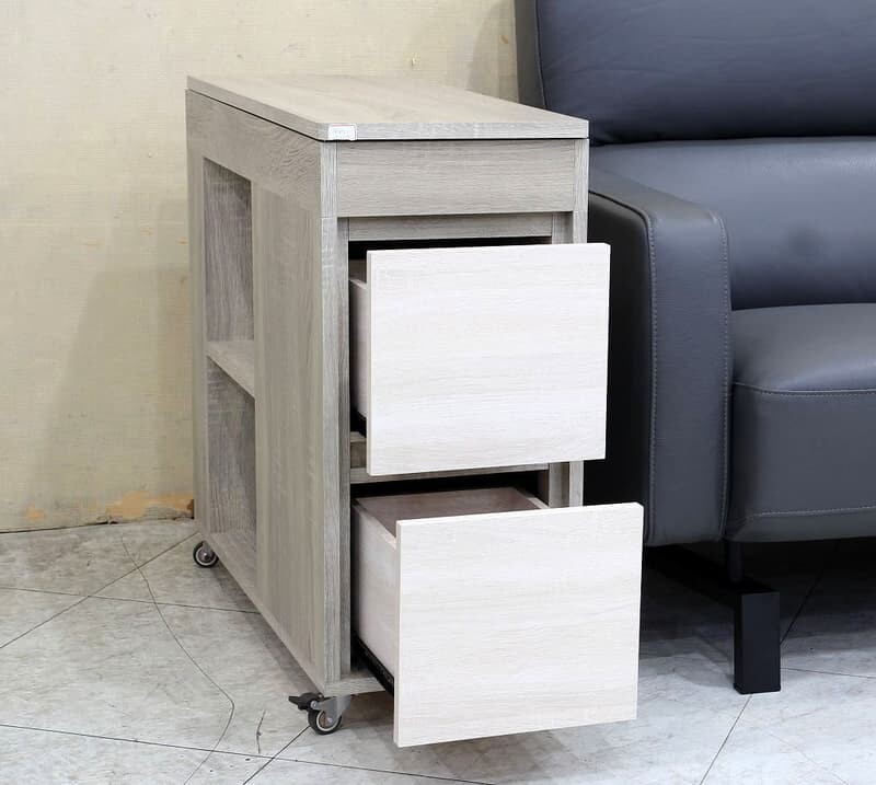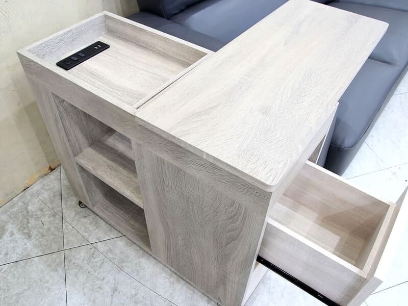 材質 | 板材 : 桶身 , 面板及門板皆為木心板材 塗裝 : 淺灰橡+白梧桐色耐磨木皮 , 桌面圓弧彎角設計 五金 : 內建二抽採鋼珠滑軌, 桌面可360度旋轉 ,內建二組插座及二組USB 充電孔,5cm高可煞車輪腳 |