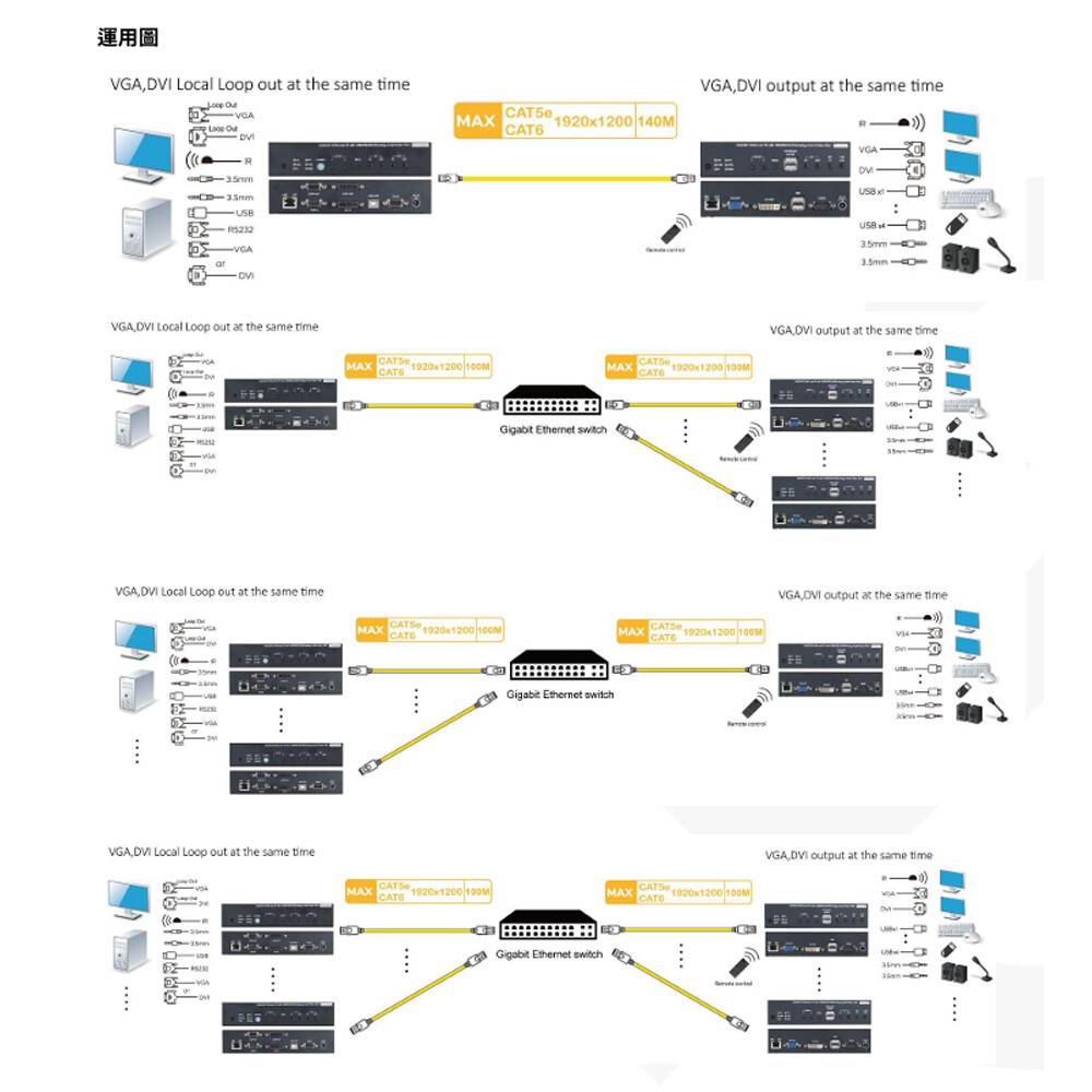 -搭配網路交換器使用,可將VGA或DVI訊號延長、分配、切換、矩陣。