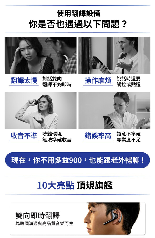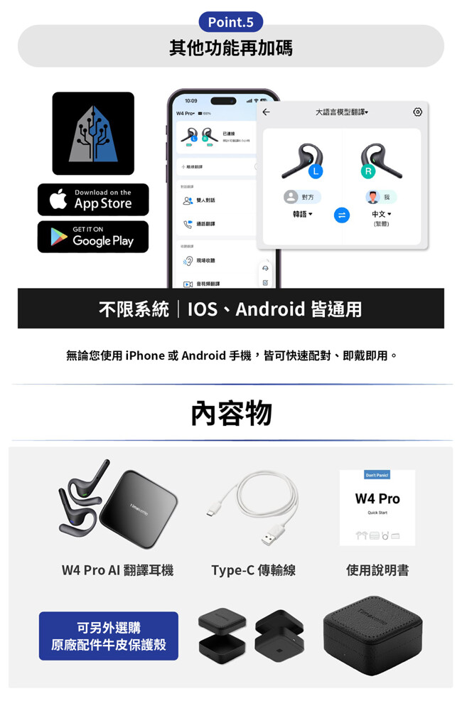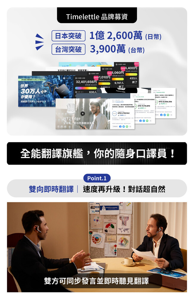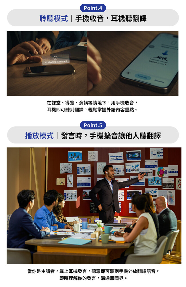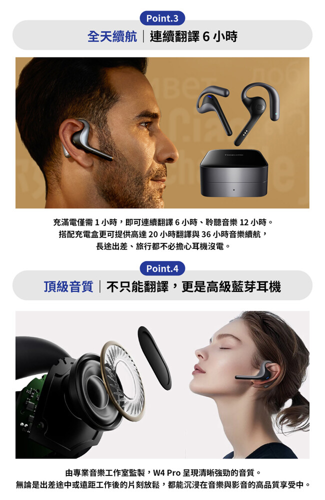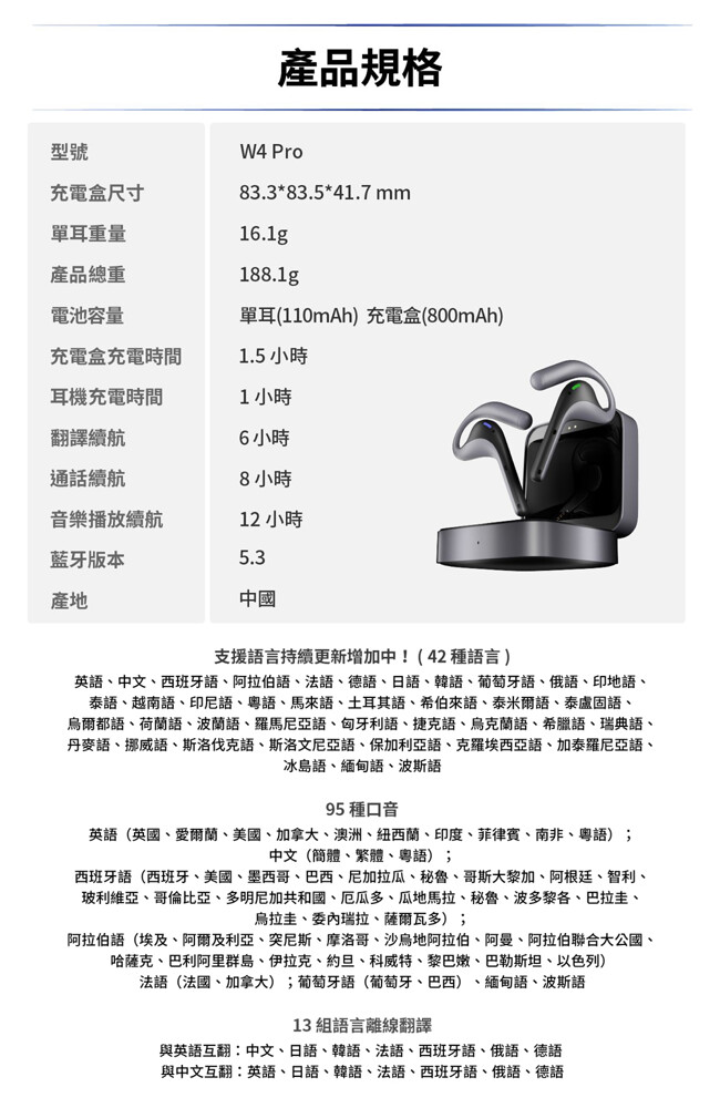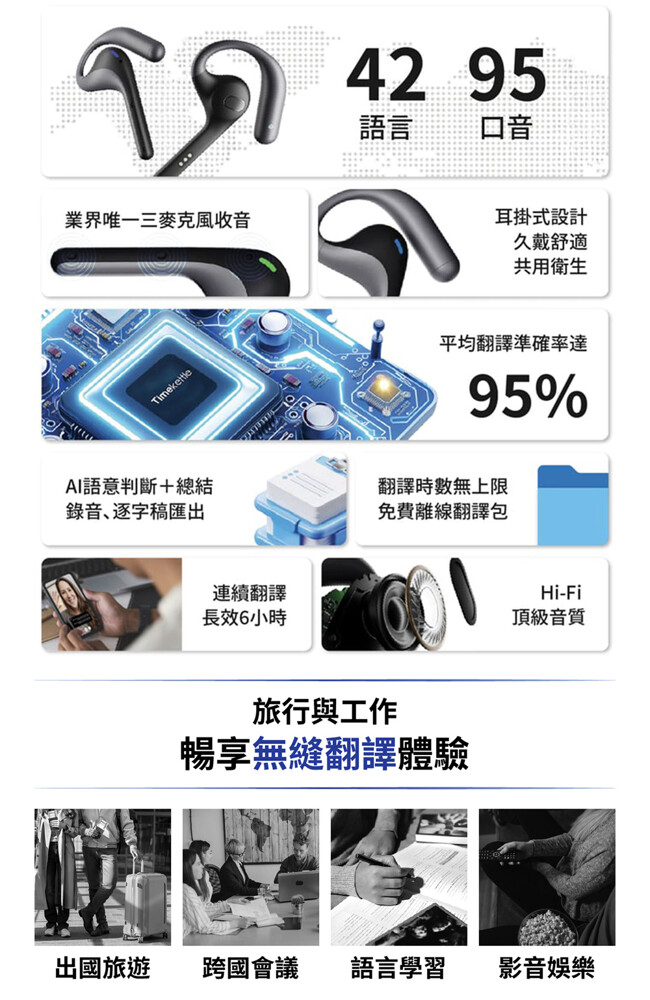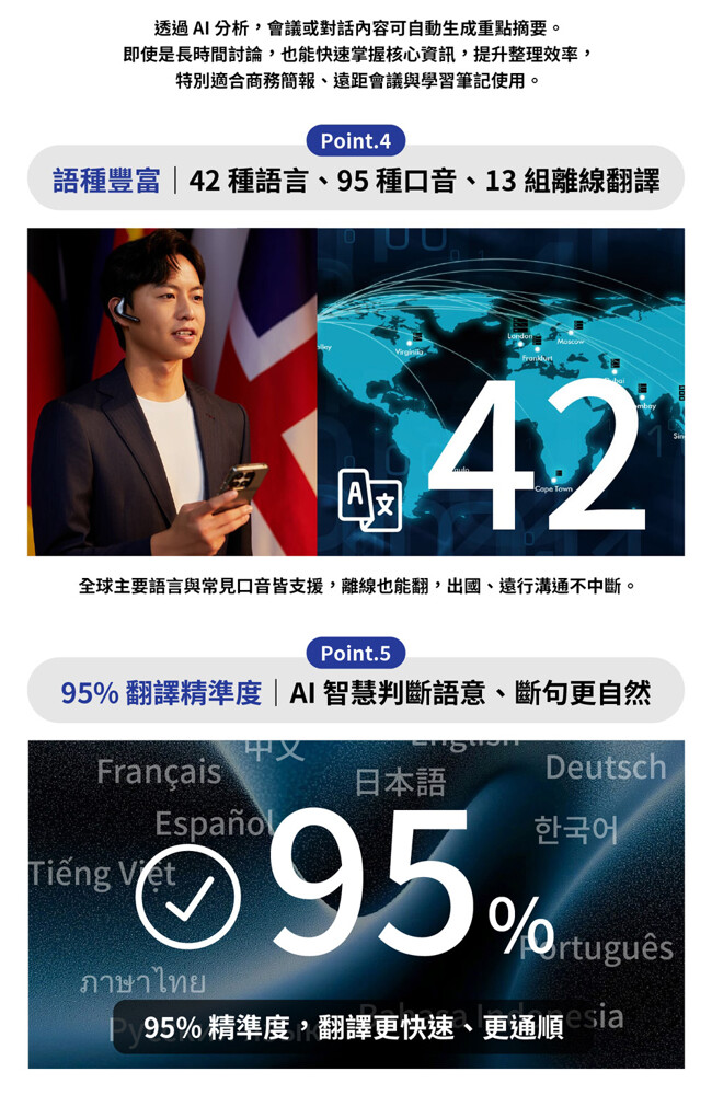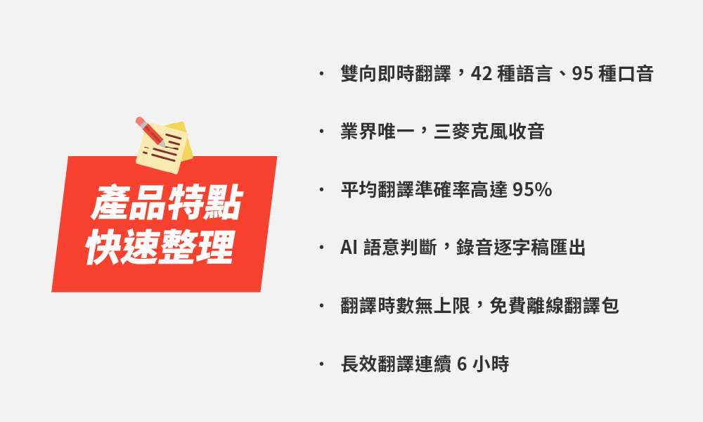 產品特點 ˙雙向即時翻譯,42 種語言、95 種口音 ˙業界唯一,三麥克風收音 ˙平均翻譯準確率高達 95% ˙AI 語意判斷,錄音逐字稿匯出 ˙翻譯時數無上限,免費離線翻譯包 ˙長效翻譯連續 6 小時